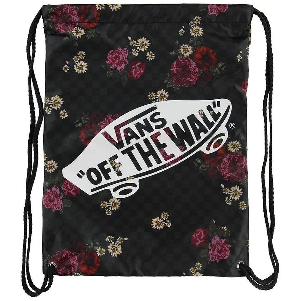 Čierne vrecko Vans Benches Bag pre dámy, na ktorom je zobrazený kvetinový vzor kombinujúci červenú, ružovú, bielu a žltú farbu. Vpredu sa nachádza veľká biela potlač s logom značky. Vrecko tvoria čierne ramenné popruhy. Jeho objem je 12 litrov a rozmery sú 44.5 cm x 34.3 cm. Je vyrobené zo 100% polyesteru.
