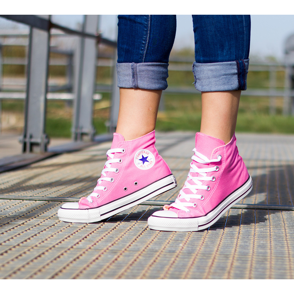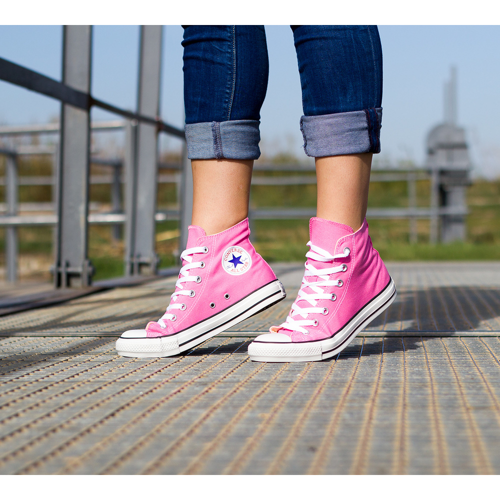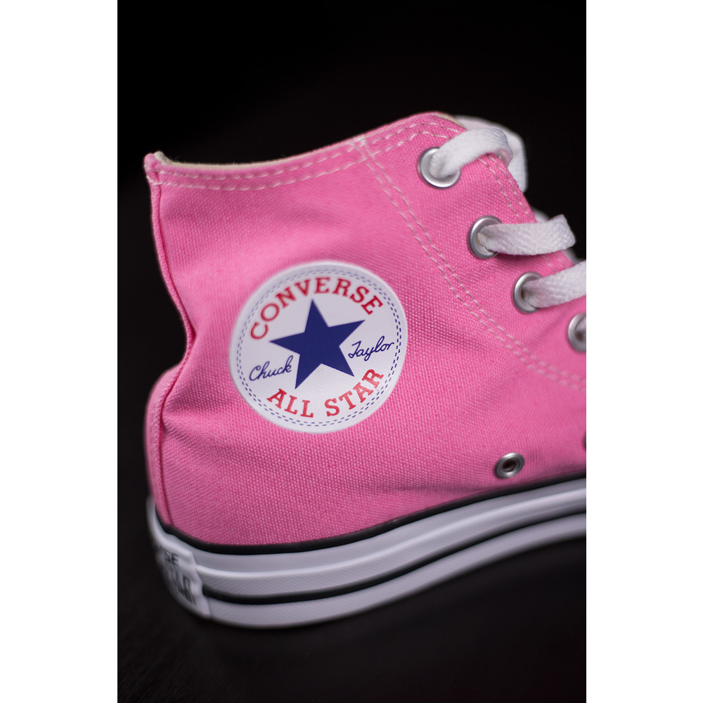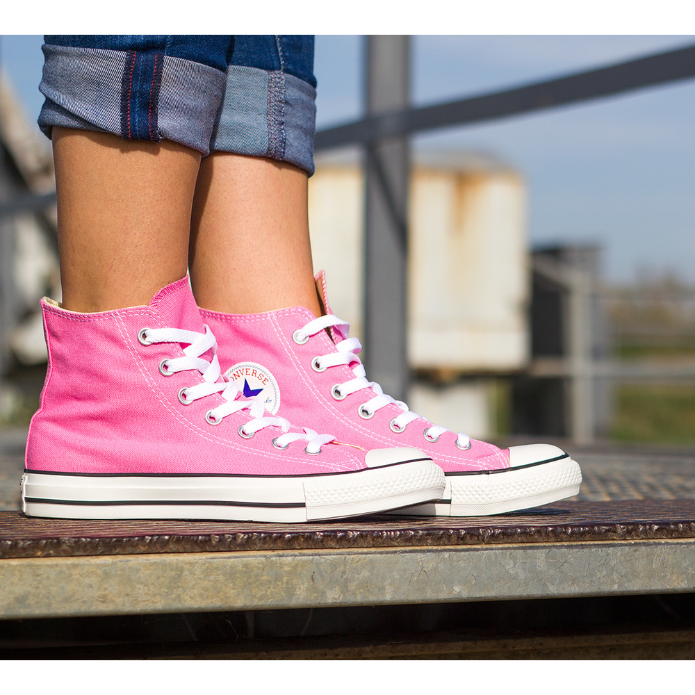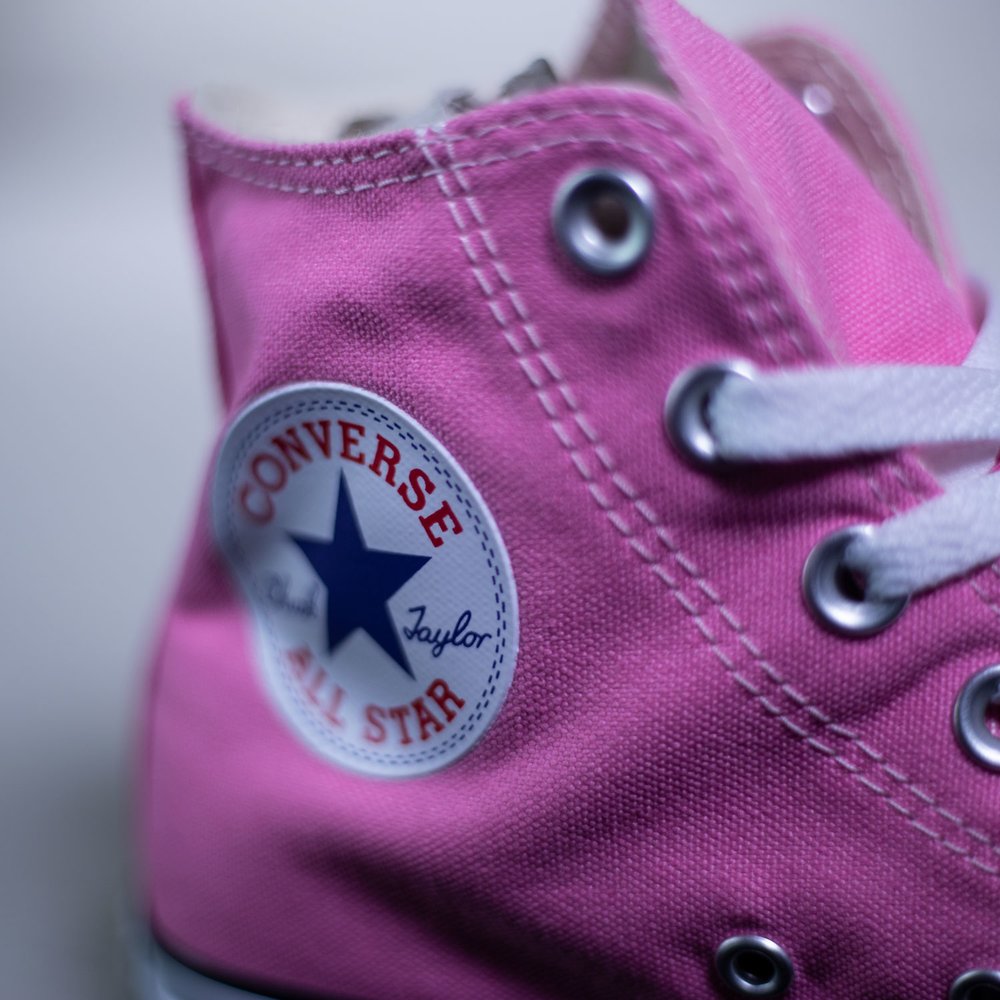 Pôvod tenisiek Chuck Taylor all star od značky Converse sa datuje do začiatku minulého storočia. Vzhľad tenisiek je nestarnúci a vždy trendy. Zvršok látkového materiálu je vsiežej ružovej farbe. Dierky na uchopenie šnúrok sú z kovových strieborných krúžkov. Špička tenisiek je gumená a biela. Podrážka začína čiernym lemom, ktorý farebne rozdeľuje zvrškový a podrážkový materiál. Podrážka je biela a zdvojená na prednej časti tenisiek, ktorý slúži na dlhšiu životnosť kritických miestach. Stredný podrážkový lem je čierny a na zadnej strane prerušený bielym gumeným prvkom, na ktorom je nápis Converse All Star. Na vnútornej strane členkovej časti je biele kruhové logo s veľkou modrou hviezdou. Vnútorný materiál tenisiek je látkový.