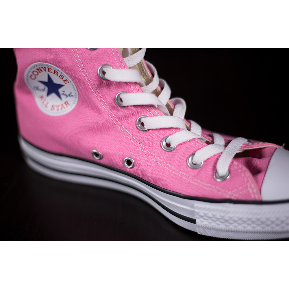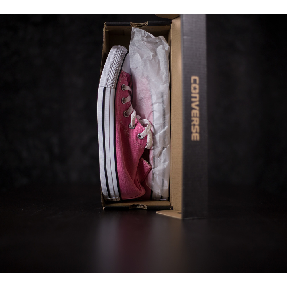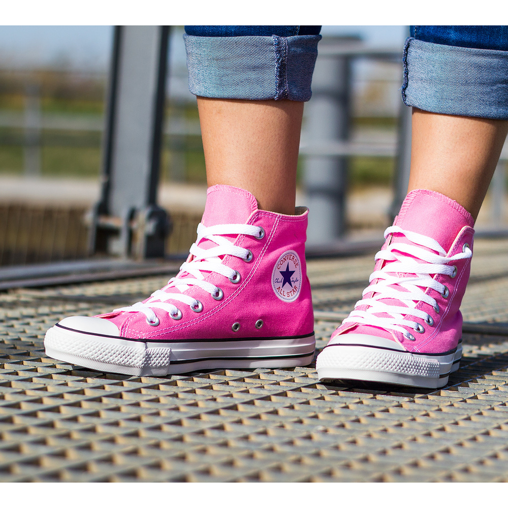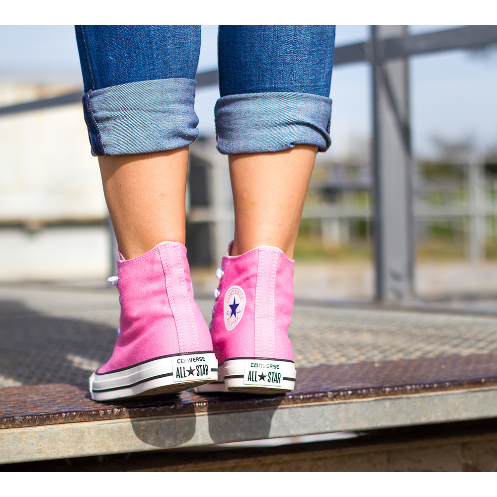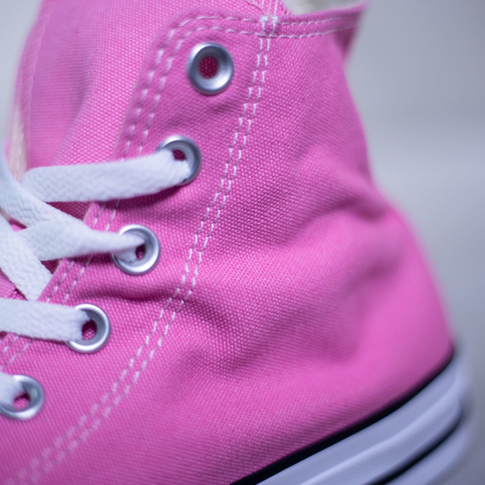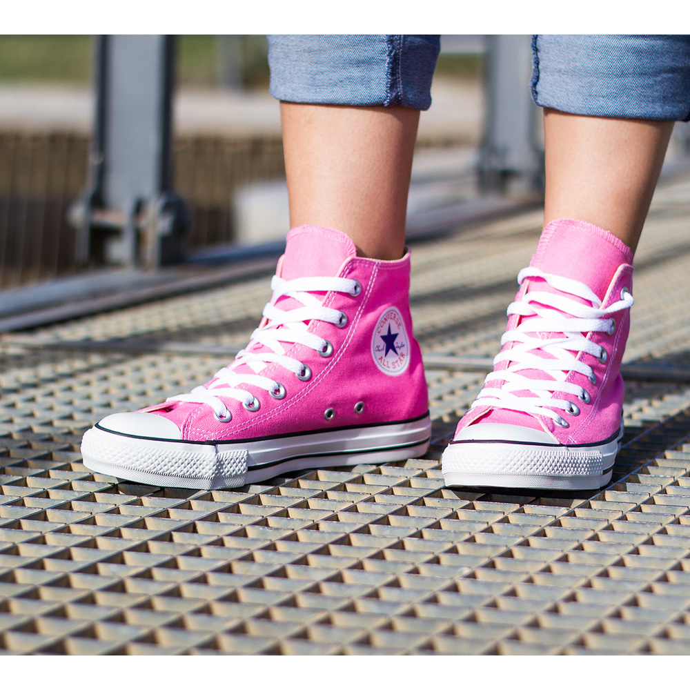 Pôvod tenisiek Chuck Taylor all star od značky Converse sa datuje do začiatku minulého storočia. Vzhľad tenisiek je nestarnúci a vždy trendy. Zvršok látkového materiálu je vsiežej ružovej farbe. Dierky na uchopenie šnúrok sú z kovových strieborných krúžkov. Špička tenisiek je gumená a biela. Podrážka začína čiernym lemom, ktorý farebne rozdeľuje zvrškový a podrážkový materiál. Podrážka je biela a zdvojená na prednej časti tenisiek, ktorý slúži na dlhšiu životnosť kritických miestach. Stredný podrážkový lem je čierny a na zadnej strane prerušený bielym gumeným prvkom, na ktorom je nápis Converse All Star. Na vnútornej strane členkovej časti je biele kruhové logo s veľkou modrou hviezdou. Vnútorný materiál tenisiek je látkový.