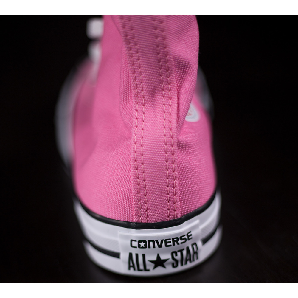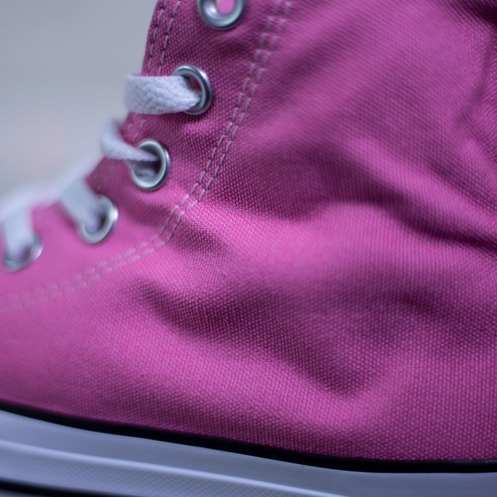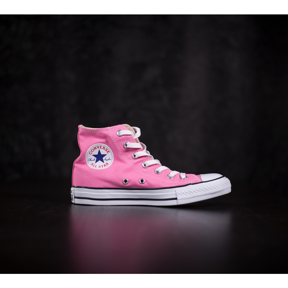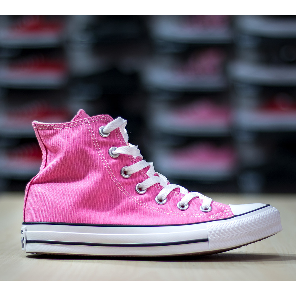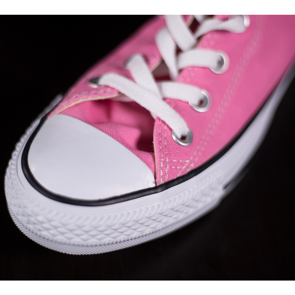 Pôvod tenisiek Chuck Taylor all star od značky Converse sa datuje do začiatku minulého storočia. Vzhľad tenisiek je nestarnúci a vždy trendy. Zvršok látkového materiálu je vsiežej ružovej farbe. Dierky na uchopenie šnúrok sú z kovových strieborných krúžkov. Špička tenisiek je gumená a biela. Podrážka začína čiernym lemom, ktorý farebne rozdeľuje zvrškový a podrážkový materiál. Podrážka je biela a zdvojená na prednej časti tenisiek, ktorý slúži na dlhšiu životnosť kritických miestach. Stredný podrážkový lem je čierny a na zadnej strane prerušený bielym gumeným prvkom, na ktorom je nápis Converse All Star. Na vnútornej strane členkovej časti je biele kruhové logo s veľkou modrou hviezdou. Vnútorný materiál tenisiek je látkový.