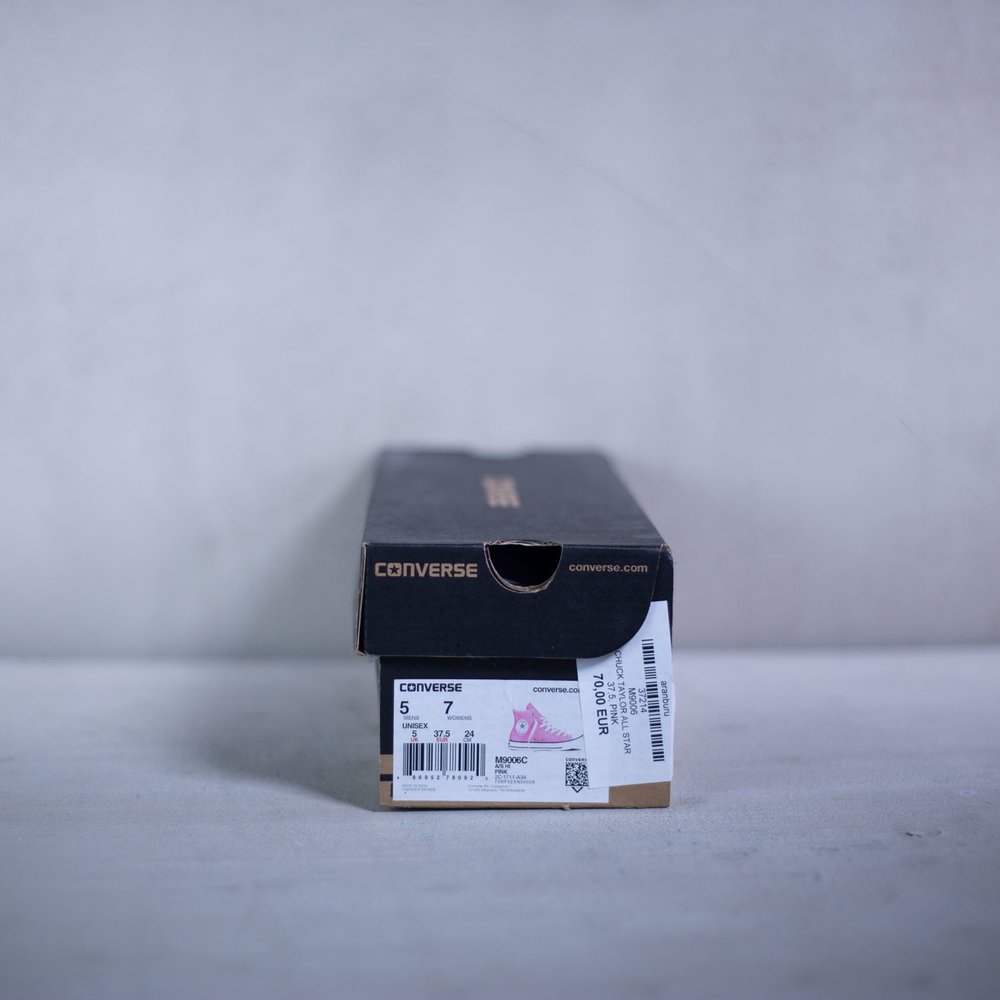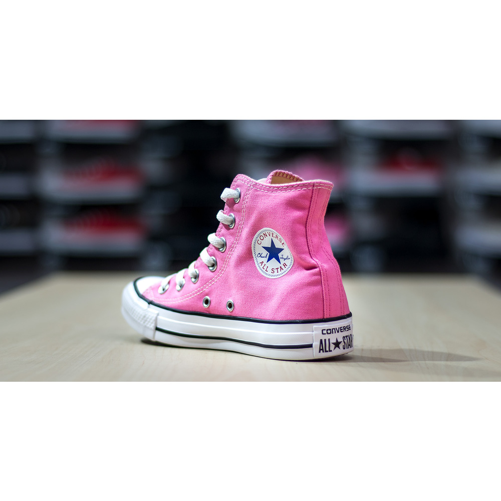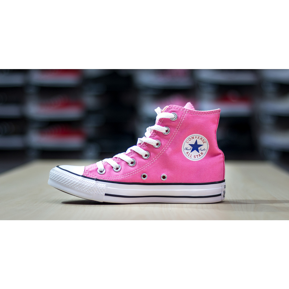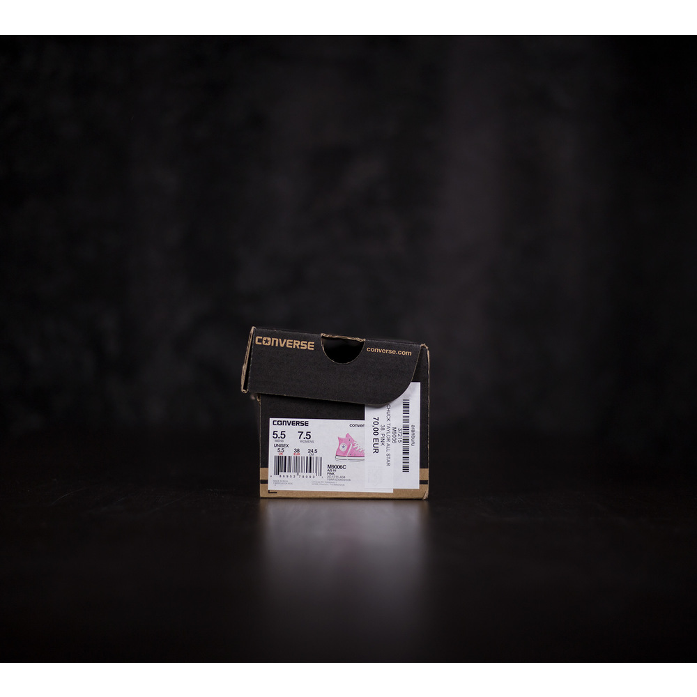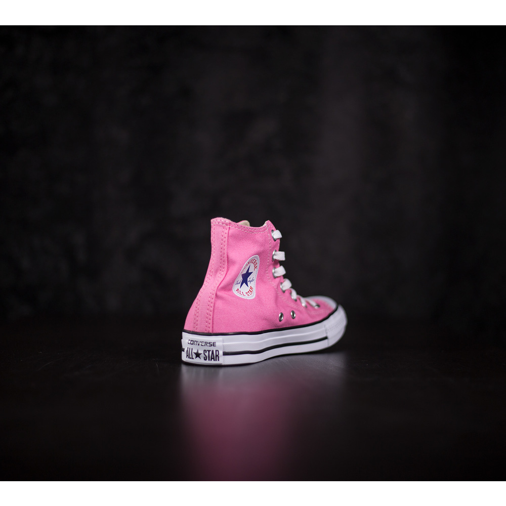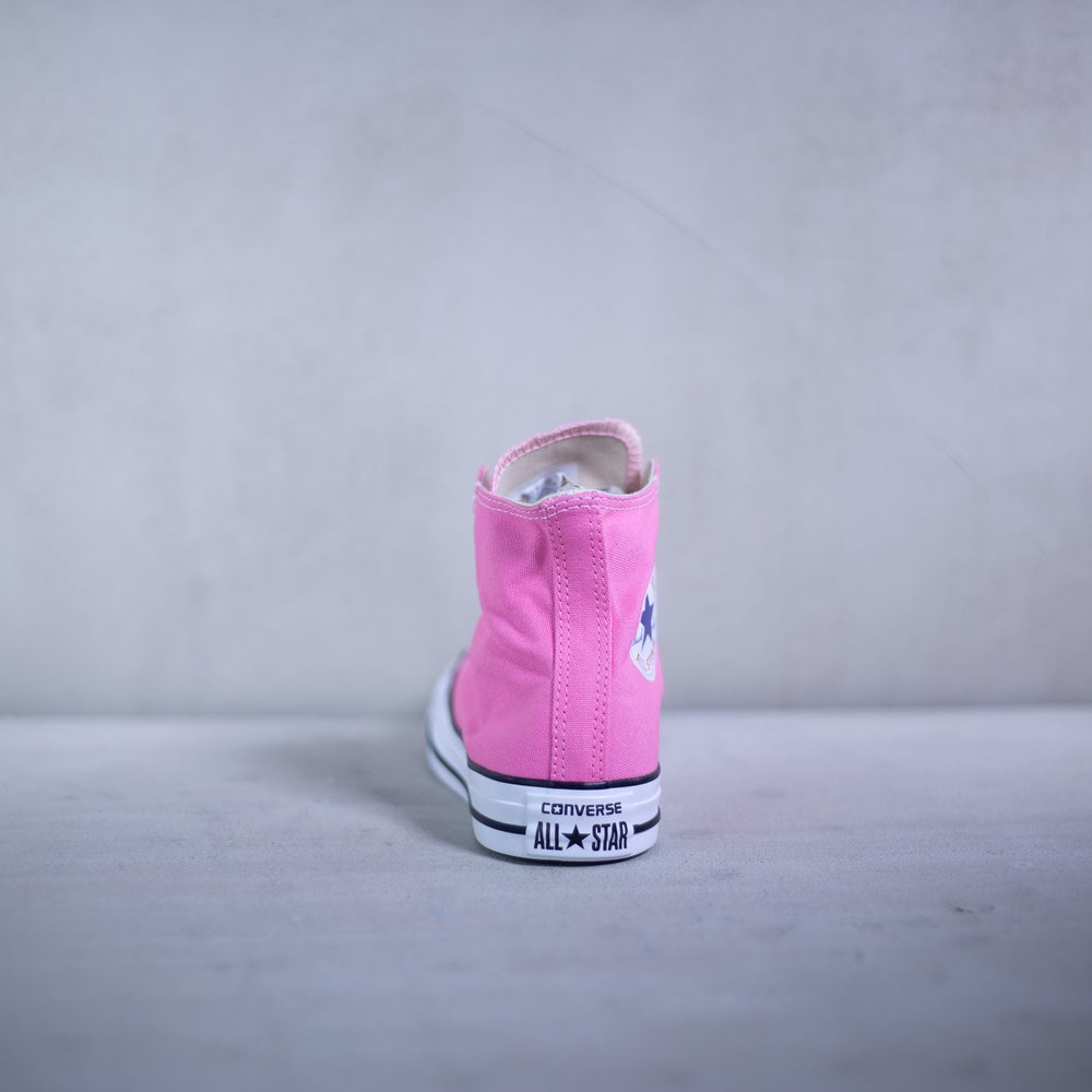 Pôvod tenisiek Chuck Taylor all star od značky Converse sa datuje do začiatku minulého storočia. Vzhľad tenisiek je nestarnúci a vždy trendy. Zvršok látkového materiálu je vsiežej ružovej farbe. Dierky na uchopenie šnúrok sú z kovových strieborných krúžkov. Špička tenisiek je gumená a biela. Podrážka začína čiernym lemom, ktorý farebne rozdeľuje zvrškový a podrážkový materiál. Podrážka je biela a zdvojená na prednej časti tenisiek, ktorý slúži na dlhšiu životnosť kritických miestach. Stredný podrážkový lem je čierny a na zadnej strane prerušený bielym gumeným prvkom, na ktorom je nápis Converse All Star. Na vnútornej strane členkovej časti je biele kruhové logo s veľkou modrou hviezdou. Vnútorný materiál tenisiek je látkový.