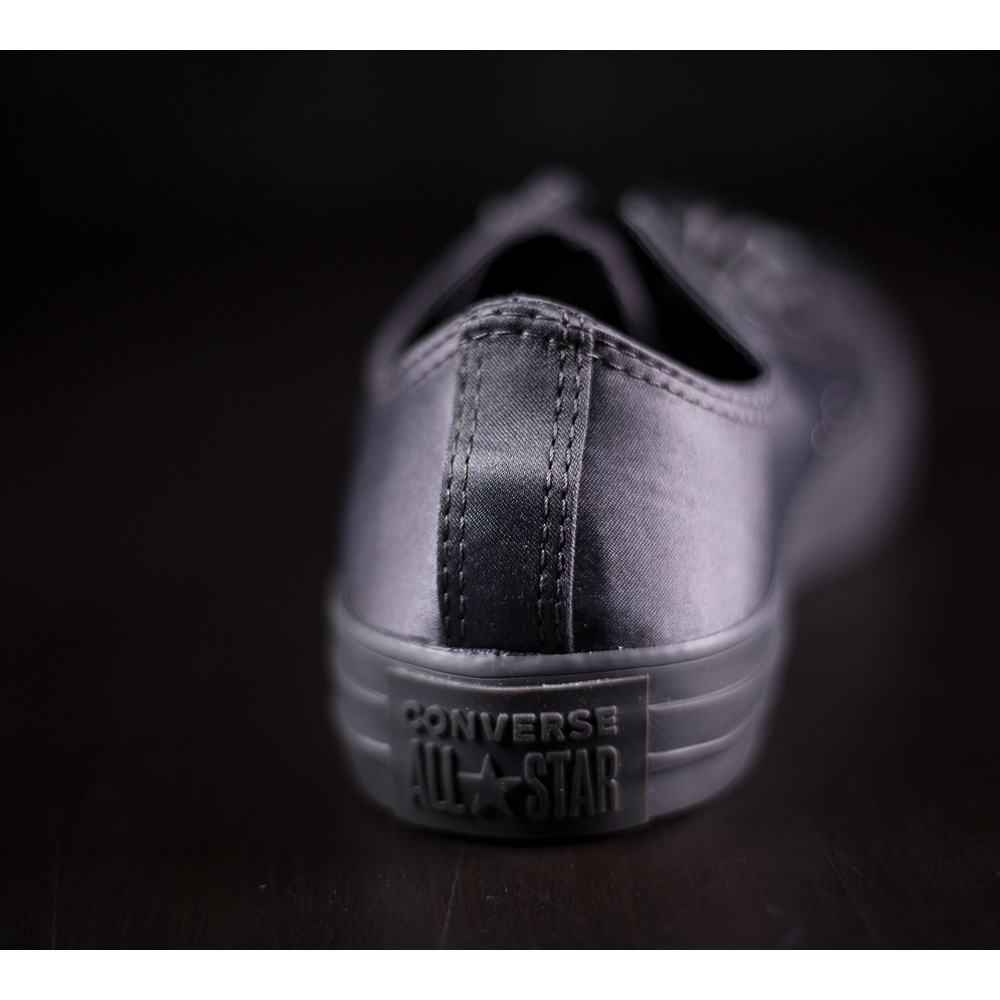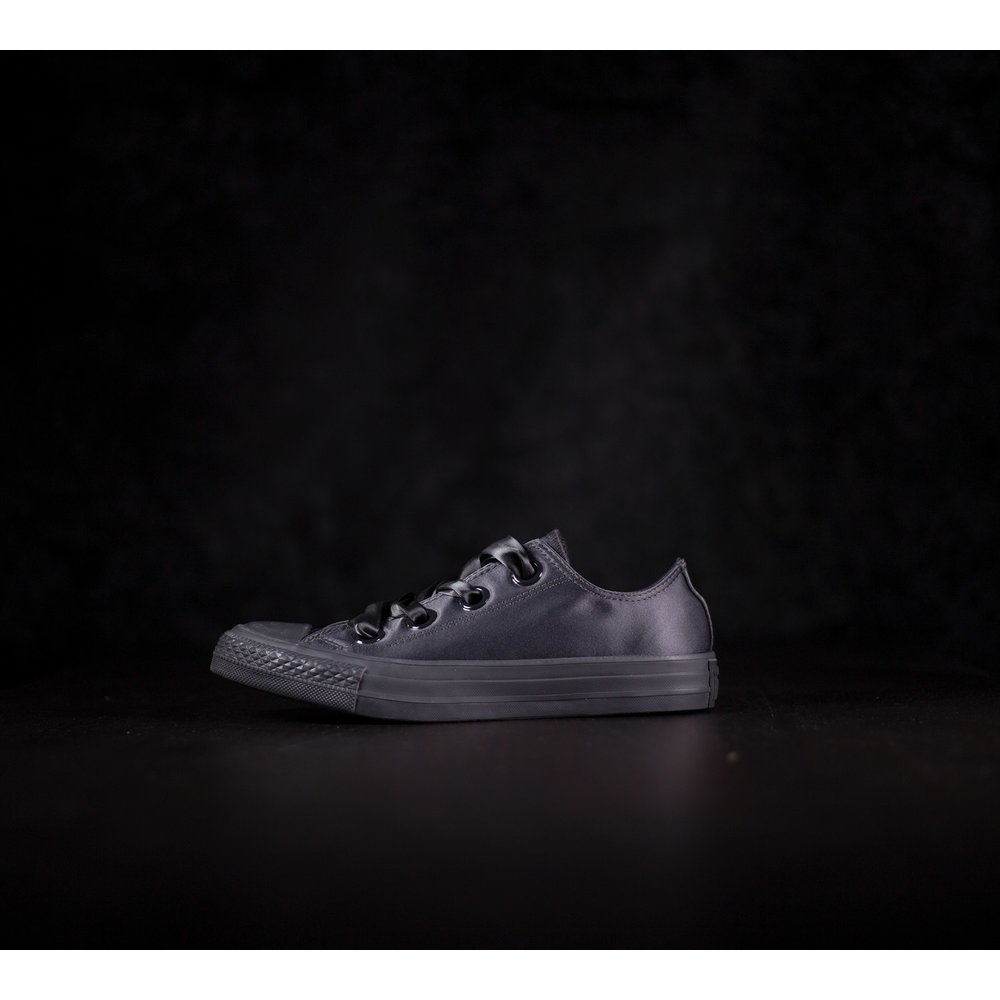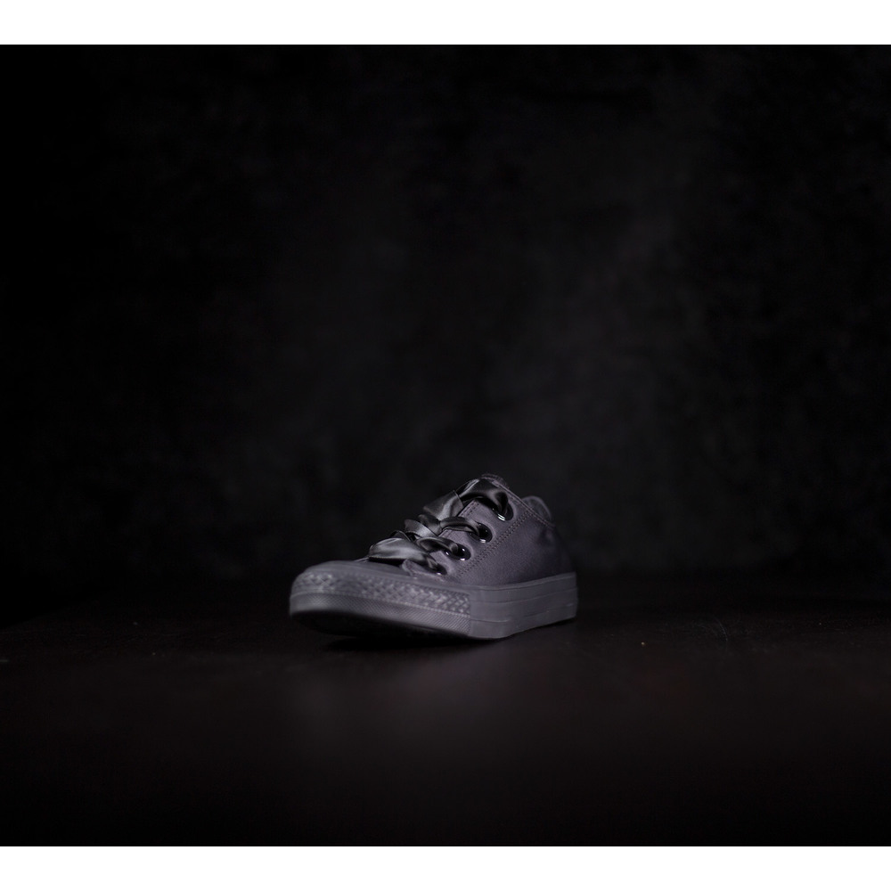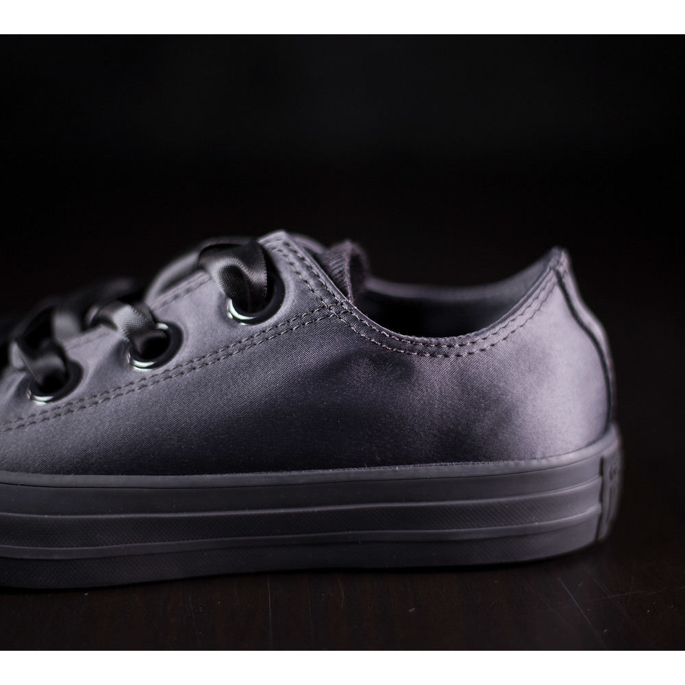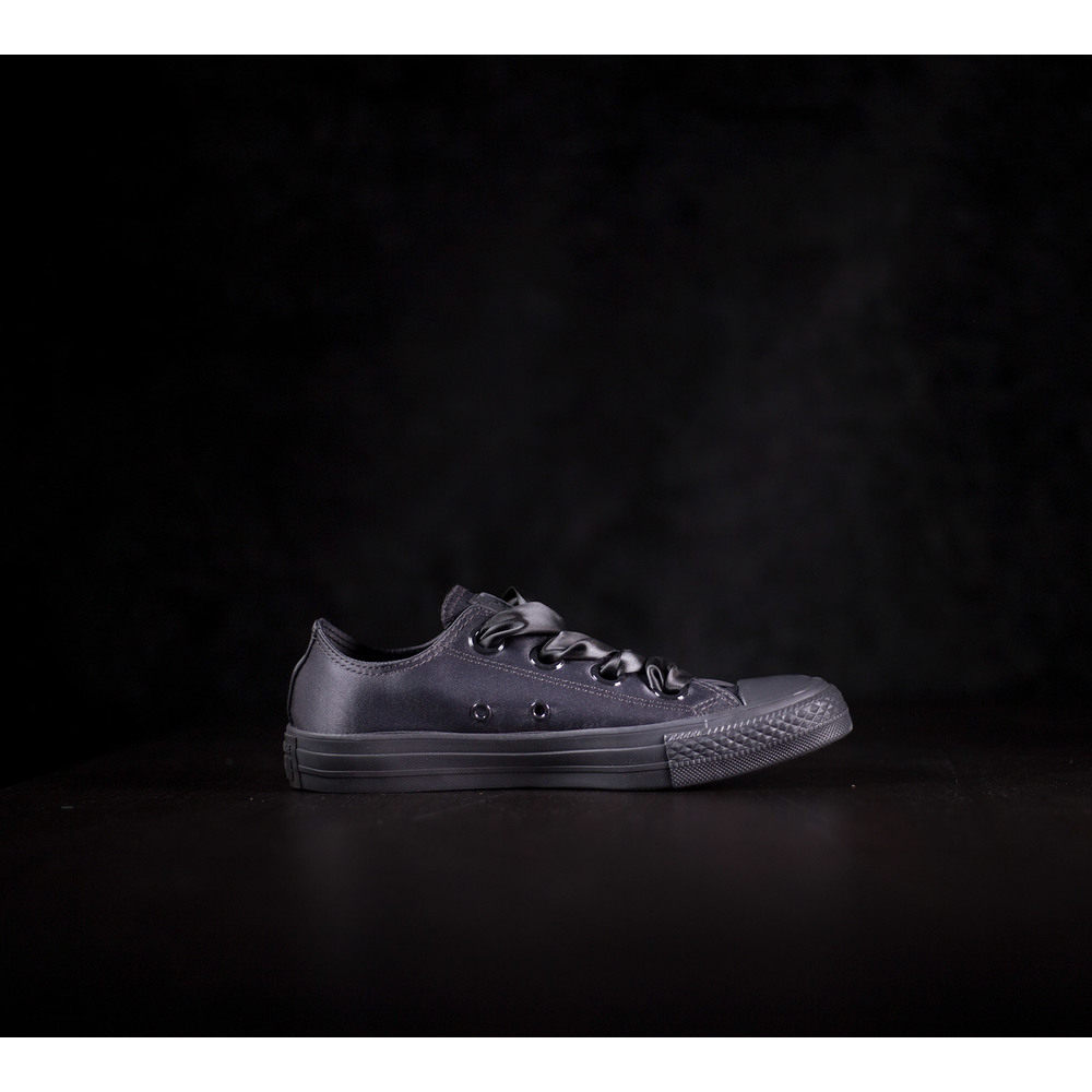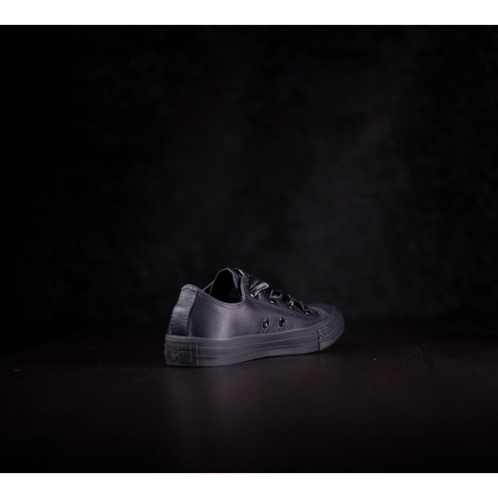 Dámske nízke tenisky Converse Chuck Taylor All Star sú celé v čiernej farbe. Tenisky majú čiernu podrážku, rovnako tak aj ikonická gumená špička je v čiernej farbe. Na pätovej strane podrážky sa nachádza logo, tiež v rovnakej farbe. Zaujímavosťou tenisiek sú hrubé čierne saténové šnúrky.