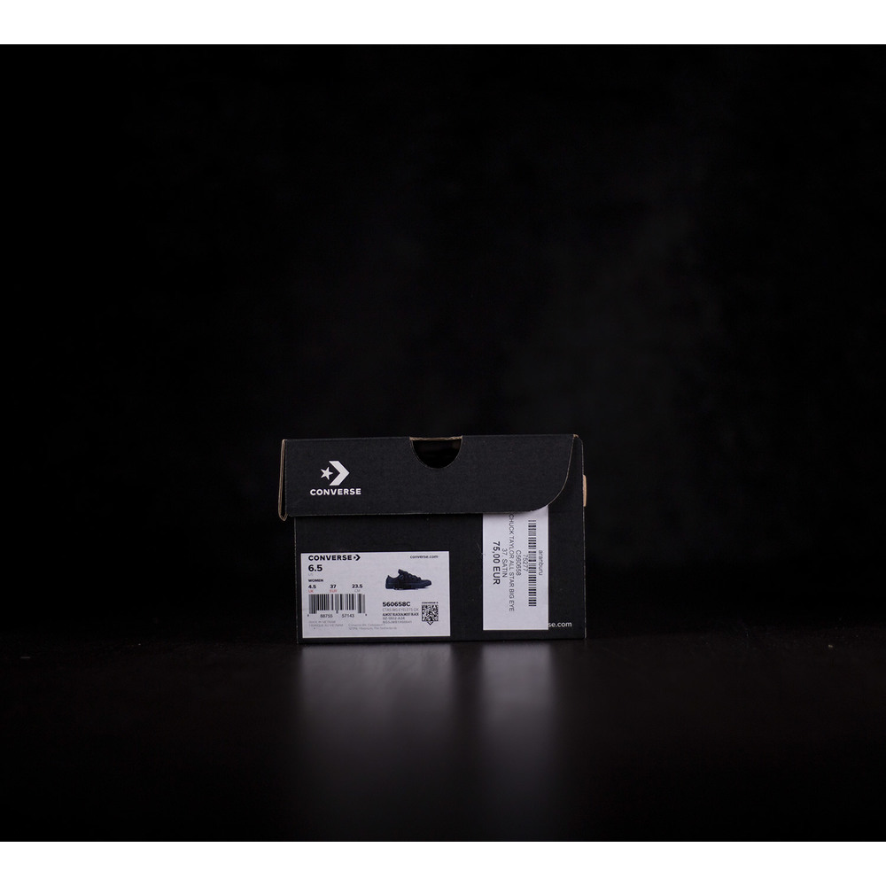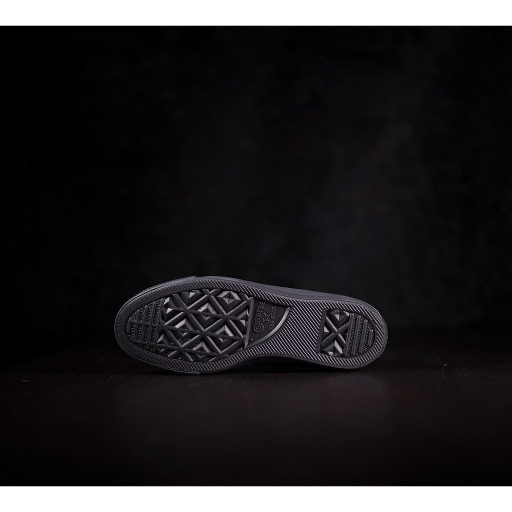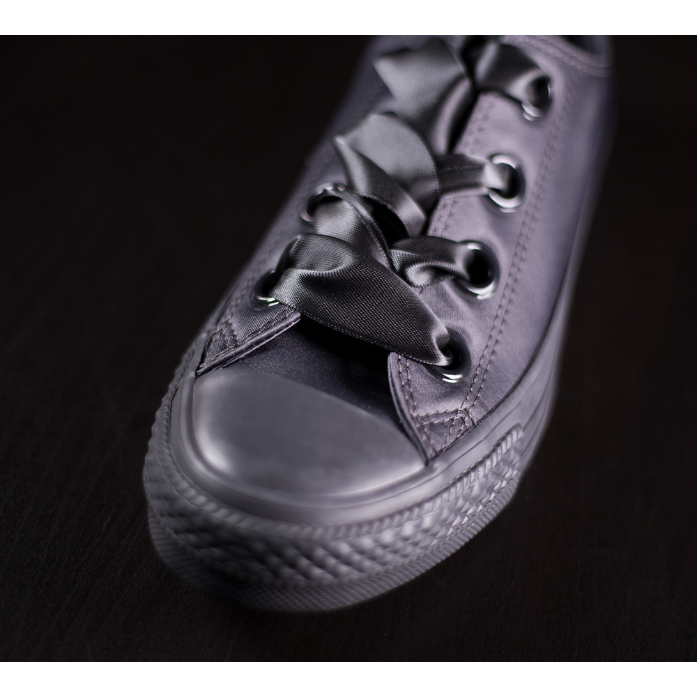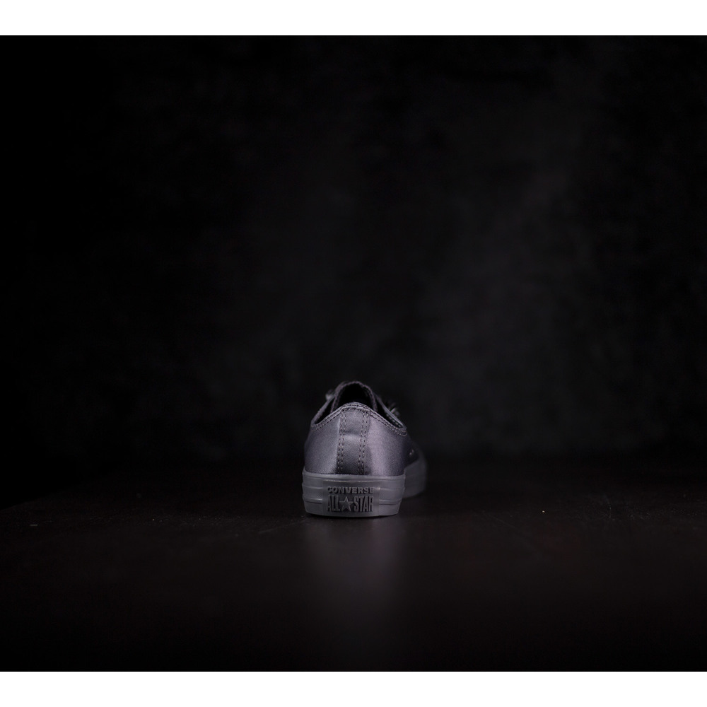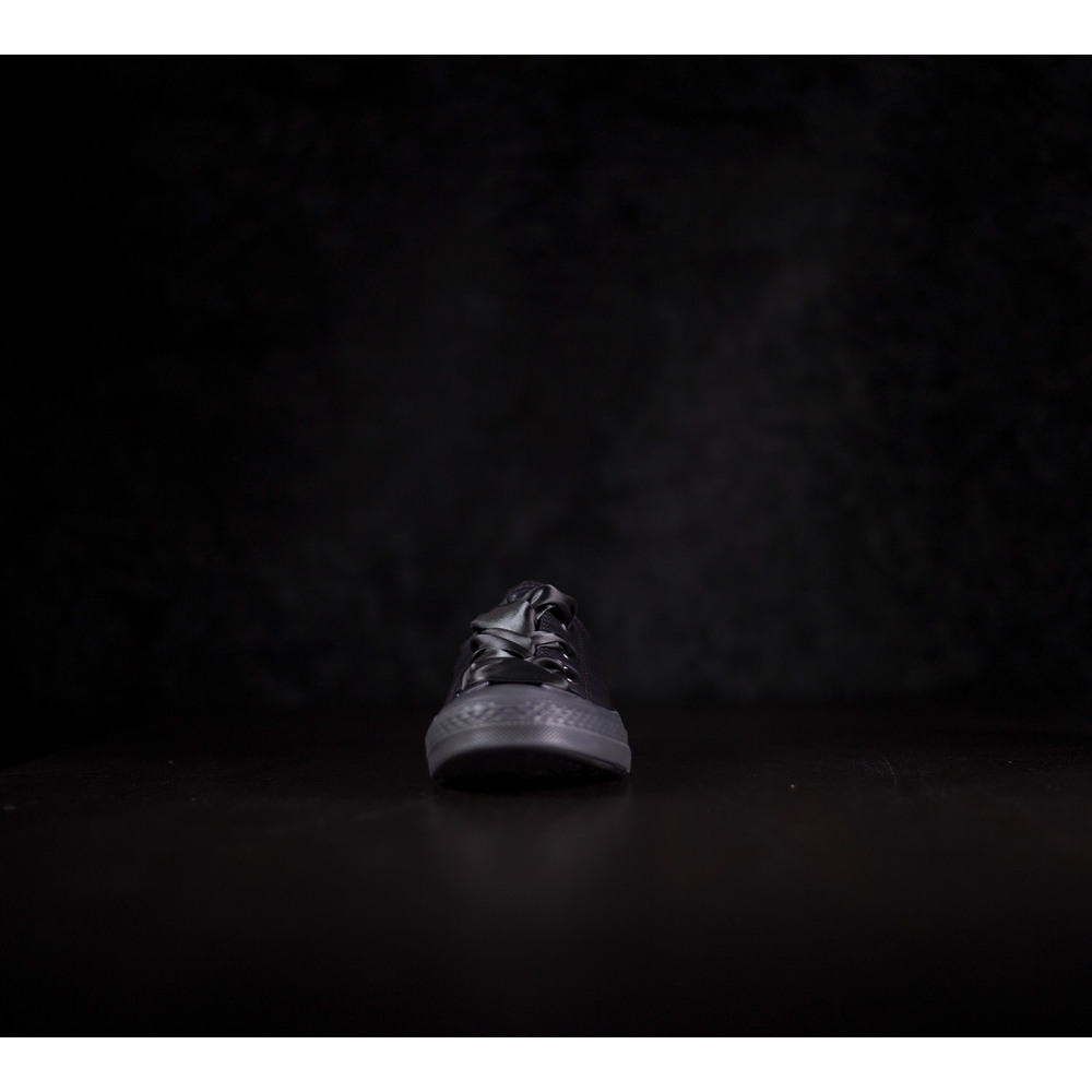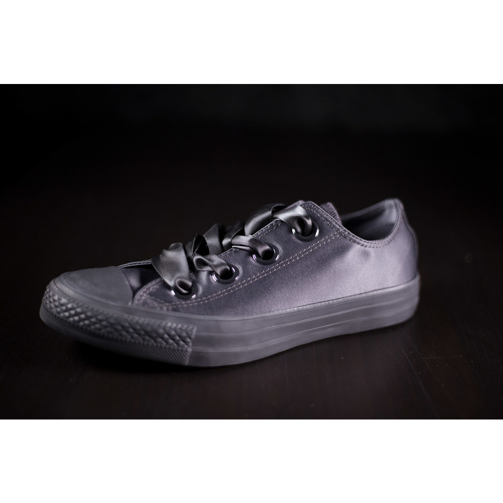 Dámske nízke tenisky Converse Chuck Taylor All Star sú celé v čiernej farbe. Tenisky majú čiernu podrážku, rovnako tak aj ikonická gumená špička je v čiernej farbe. Na pätovej strane podrážky sa nachádza logo, tiež v rovnakej farbe. Zaujímavosťou tenisiek sú hrubé čierne saténové šnúrky.