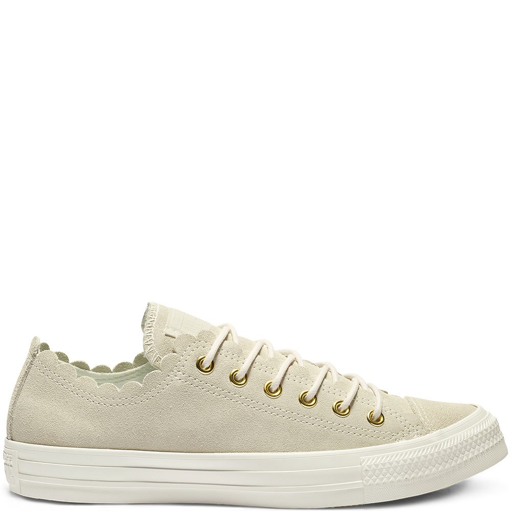 Dámske tenisky Converse model Chuck Taylor All Star Ox v béžovom prevedení. Tenisky majú zvršok z hladkej brúsenej kože, lem je tvarovaný, čo vytvára pekný ženský detail. Zvršok tenisky je prešívaný tenkou šedou nitkou. Šnurujú sa pomocou tenkých okrúhlych šnúrok v bielej farbe, ktoré prechádzajú cez zlaté kovové oká. Jazyk je dostatočne široký a nachádza sa na ňom látkový štítok s logom značky. Logo značky je aj na pätovej časti podrážky. Vnútorný materiál je príjemná mäkká látka, podrážka je vyrobená z vulkanizovanej gumy a je krémovej farby. V prednej časti je podrážky klasicky zdvojená pre vyššiu odolnosť.