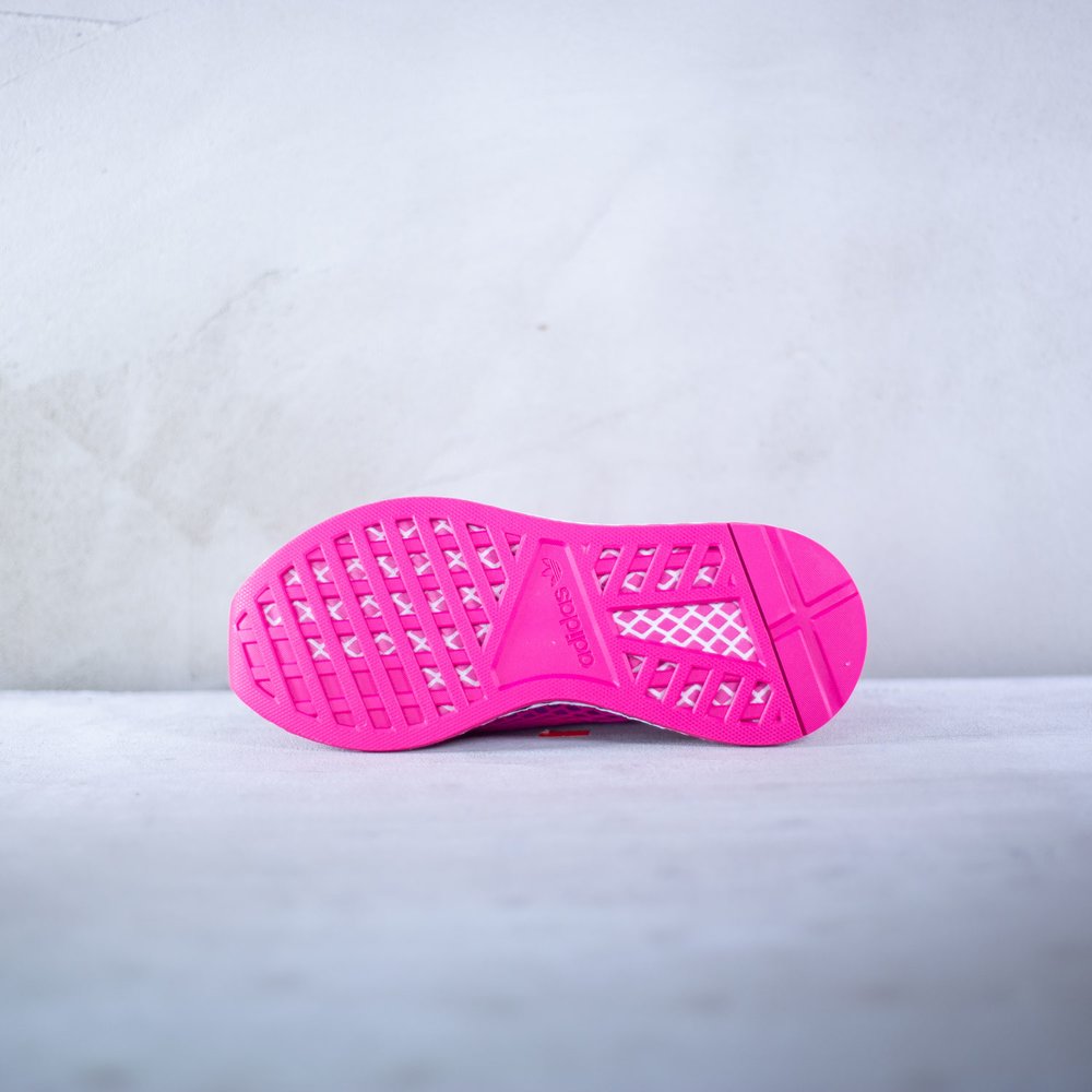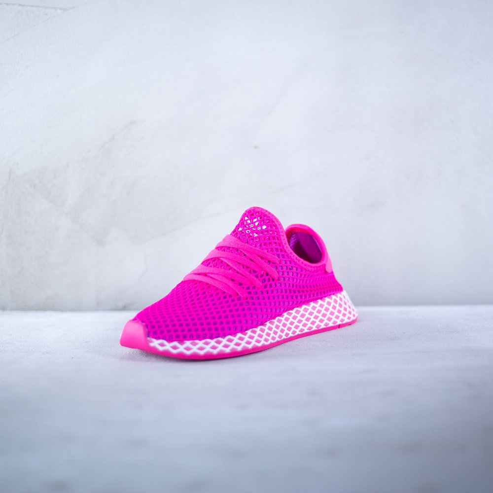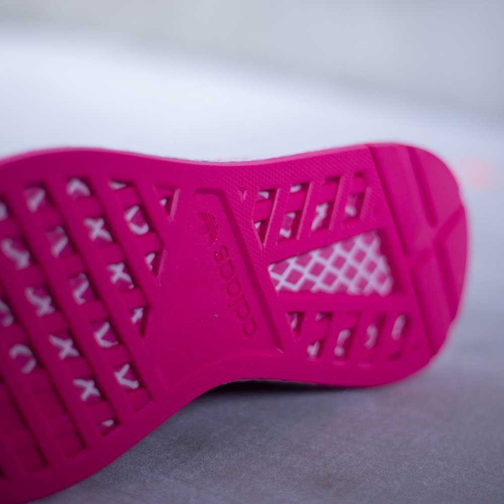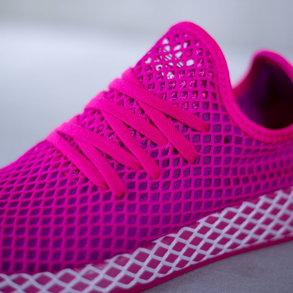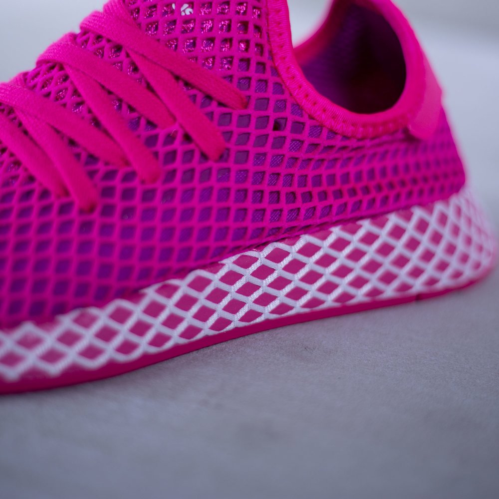 Dámske tenisky adidas model Deerupt Runner s fialovým zvrškom a s výraznou ružovou sieťkou. Tenisky sa uťahujú pomocou ružových plochých šnúrok, oblasť jazyka je potiahnutá hustejšou ružovou sieťkou a je na nej gumené logo značky adidas v bielej farbe. Logo značky je aj na päte. Zvršok tenisky je vyrobený z pružnej látky vo fialovej farbe, ktorá je potiahnurá ružovou sieťkou. Podrážka tenisiek je ružovej farby a je potiahnutá bielou sieťkou, čo vytvára pekný kontrast. Z jej vnútornej strany sa nachádza čierny detail. Tenisky sú vybavené medzipodrážkou EVA a vložka Ortholite sa postará o vysoké pohodlie.