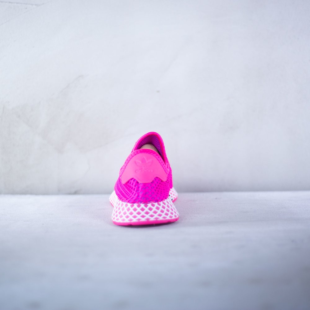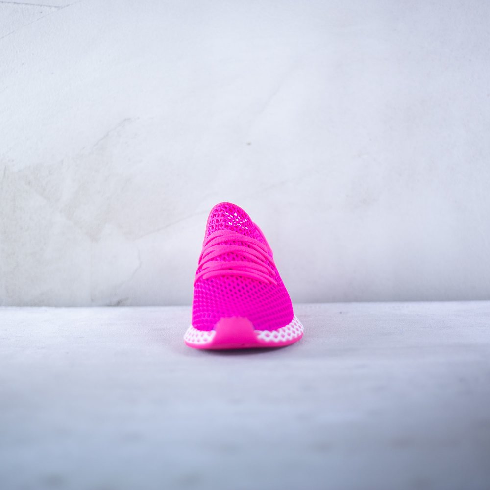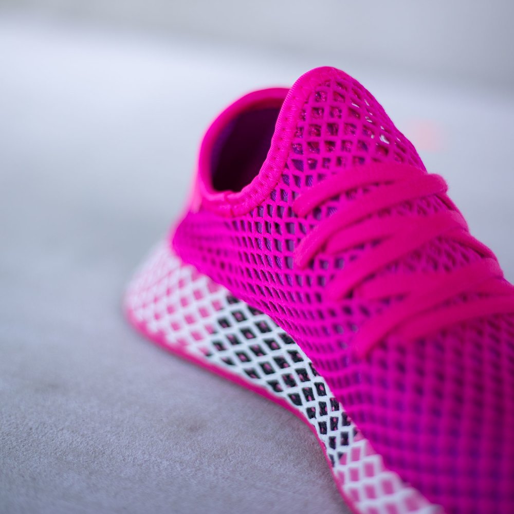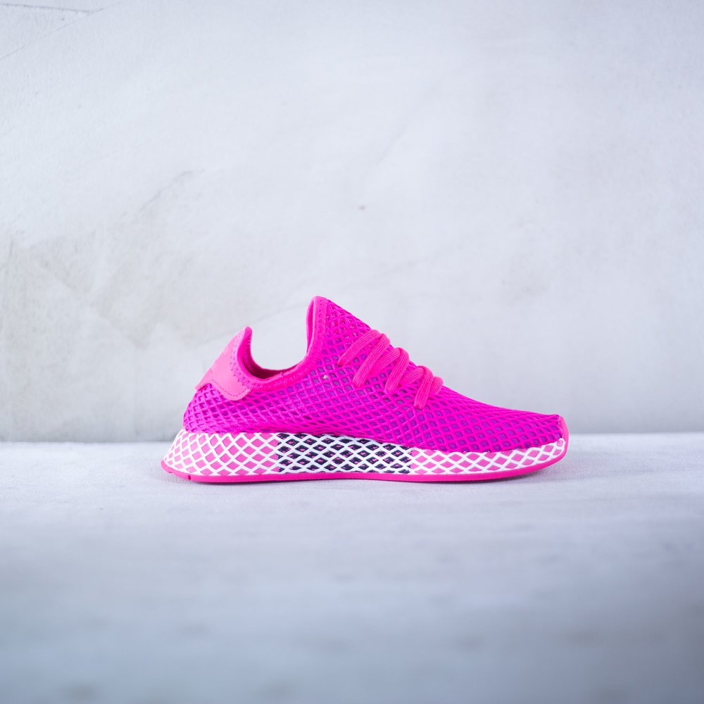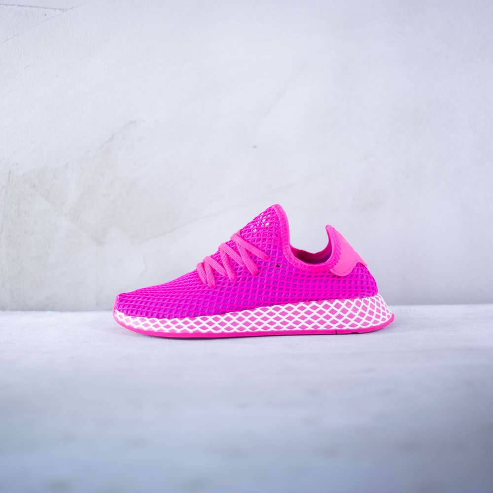 Dámske tenisky adidas model Deerupt Runner s fialovým zvrškom a s výraznou ružovou sieťkou. Tenisky sa uťahujú pomocou ružových plochých šnúrok, oblasť jazyka je potiahnutá hustejšou ružovou sieťkou a je na nej gumené logo značky adidas v bielej farbe. Logo značky je aj na päte. Zvršok tenisky je vyrobený z pružnej látky vo fialovej farbe, ktorá je potiahnurá ružovou sieťkou. Podrážka tenisiek je ružovej farby a je potiahnutá bielou sieťkou, čo vytvára pekný kontrast. Z jej vnútornej strany sa nachádza čierny detail. Tenisky sú vybavené medzipodrážkou EVA a vložka Ortholite sa postará o vysoké pohodlie.