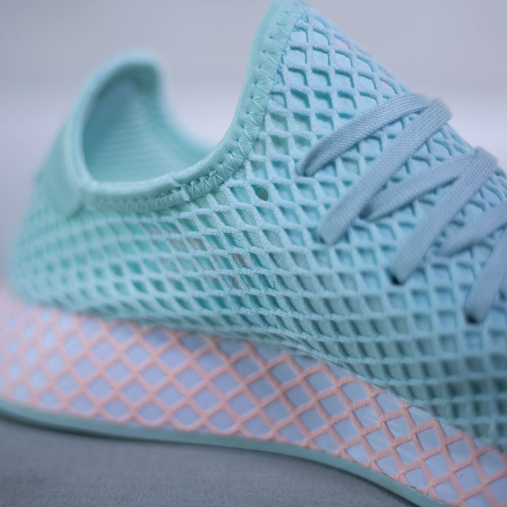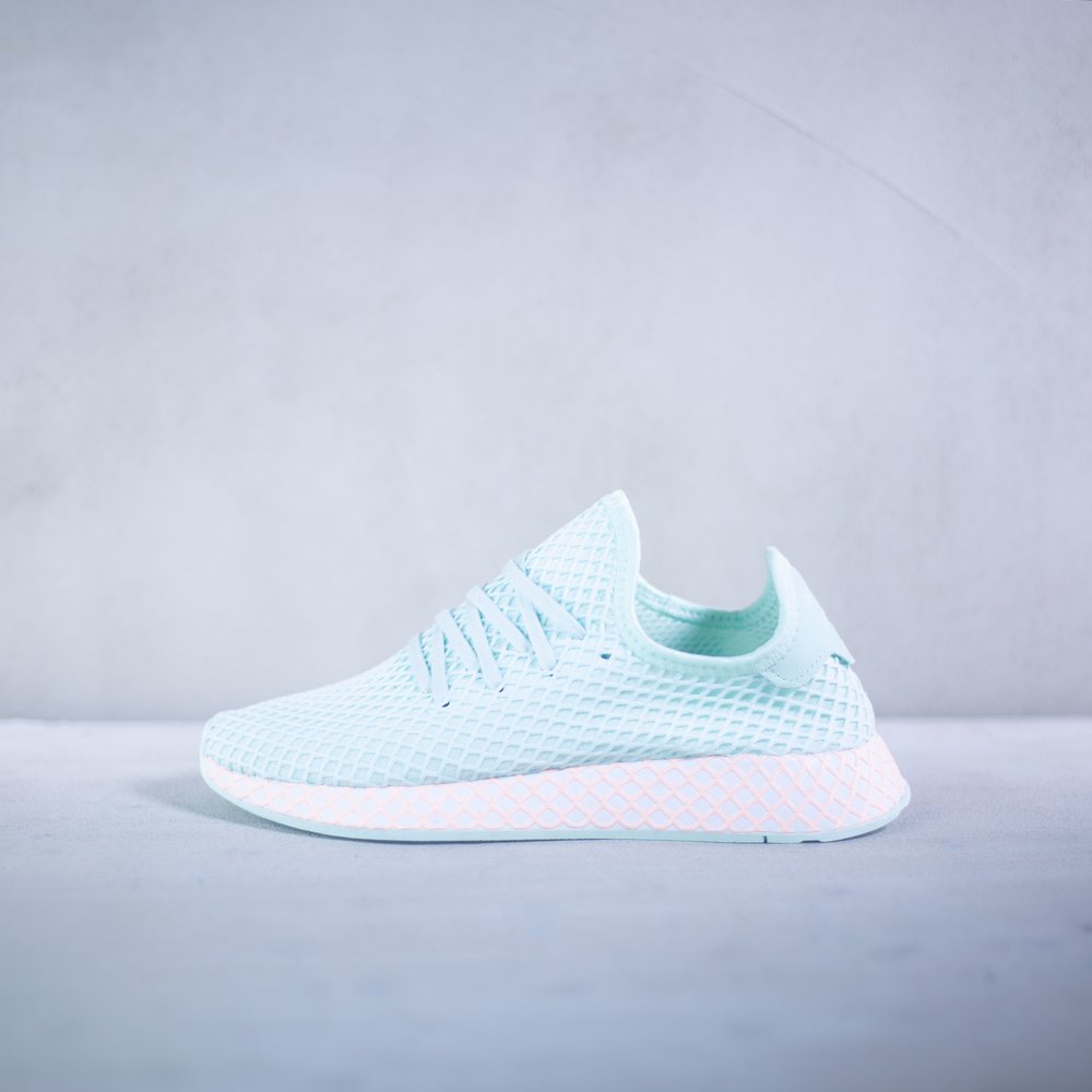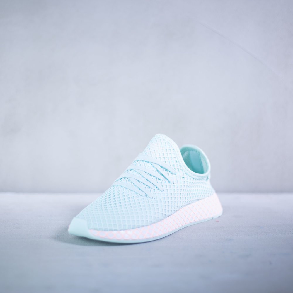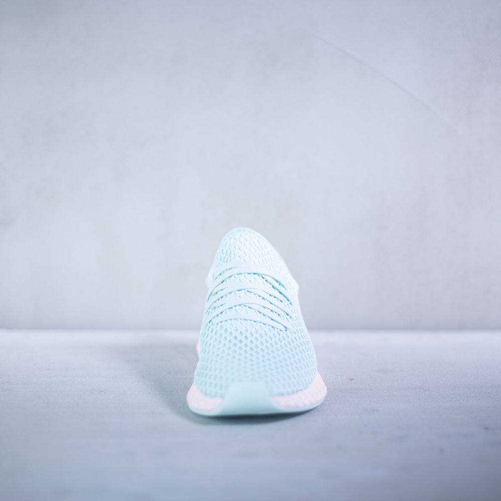 Dámske tenisky adidas model Deerupt Runner v bledomodrom prevedení s nízkym tvarom a plochými šnúrkami vo farbe tenisky. Zvršok tenisky je z poddajnej látky, ktorá je potiahnutá sieťovinou rovnakej farby. V časti pod šnúrkami sa nachádza oranžovo-ružové logo značky adidas. Logo značky je aj na päte na časti z jemnej kože. Podrážka tenisky je vyrobená z gumy, je bielej farby a je na nej potiahnutá sieťka v oranžovo-ružove farbe. Podrážka na špičke presahuje do zvršku tenisky. Tenisky majú medzipodrážku z materiálu EVA a vložku Ortholite.