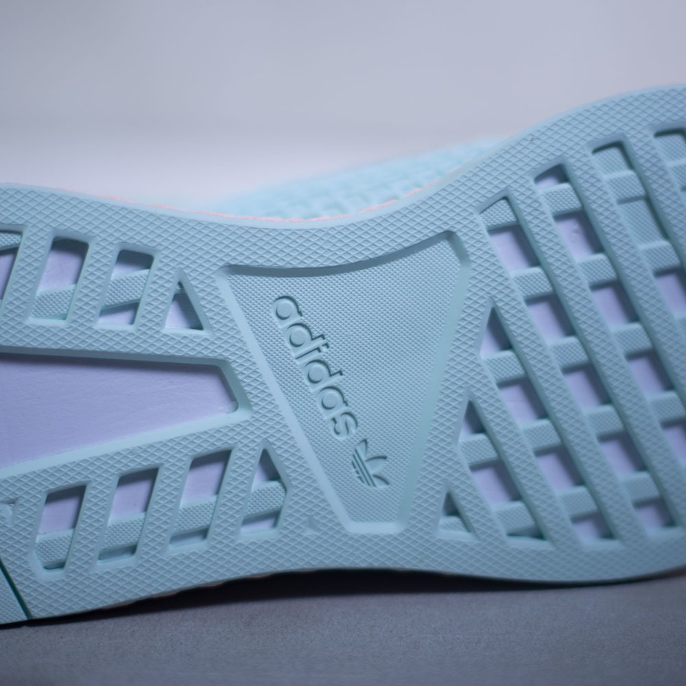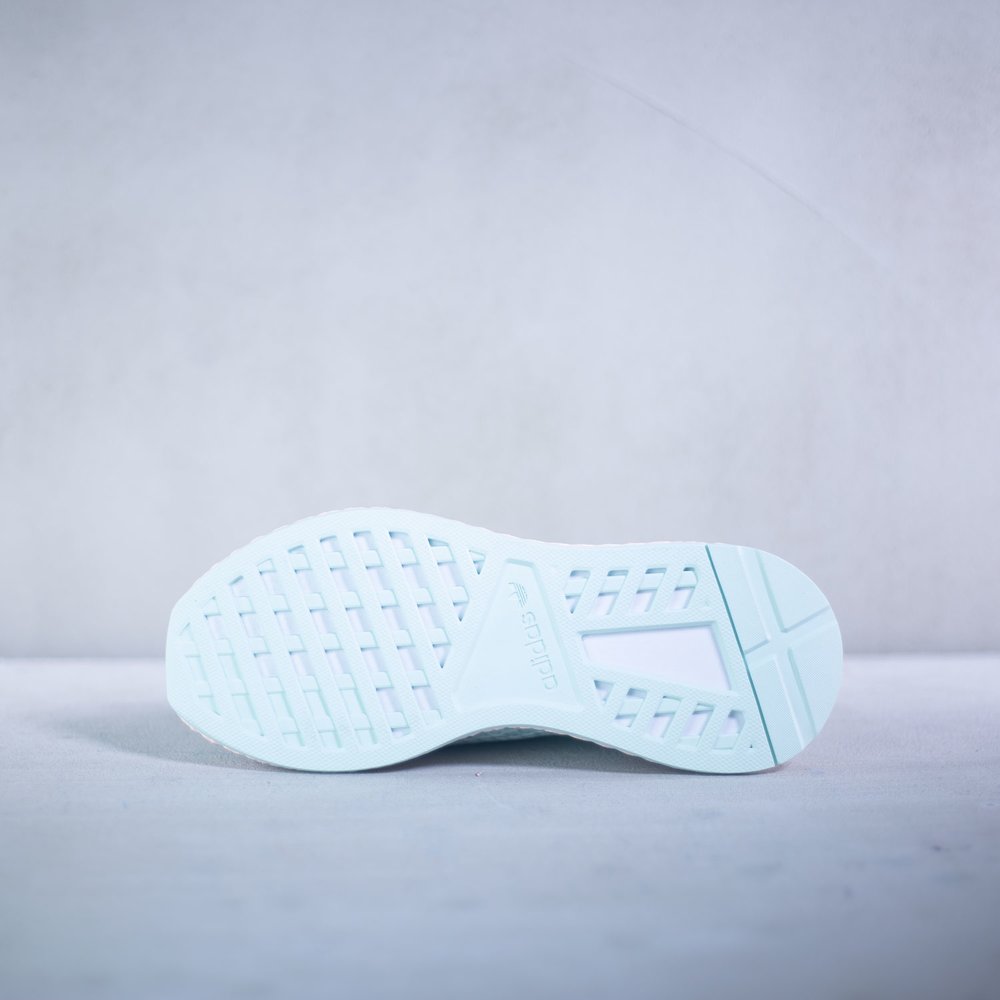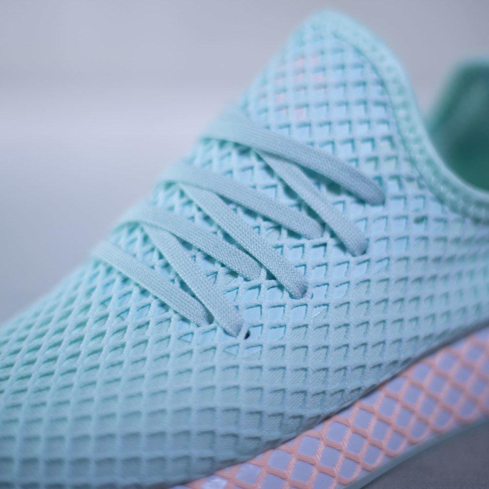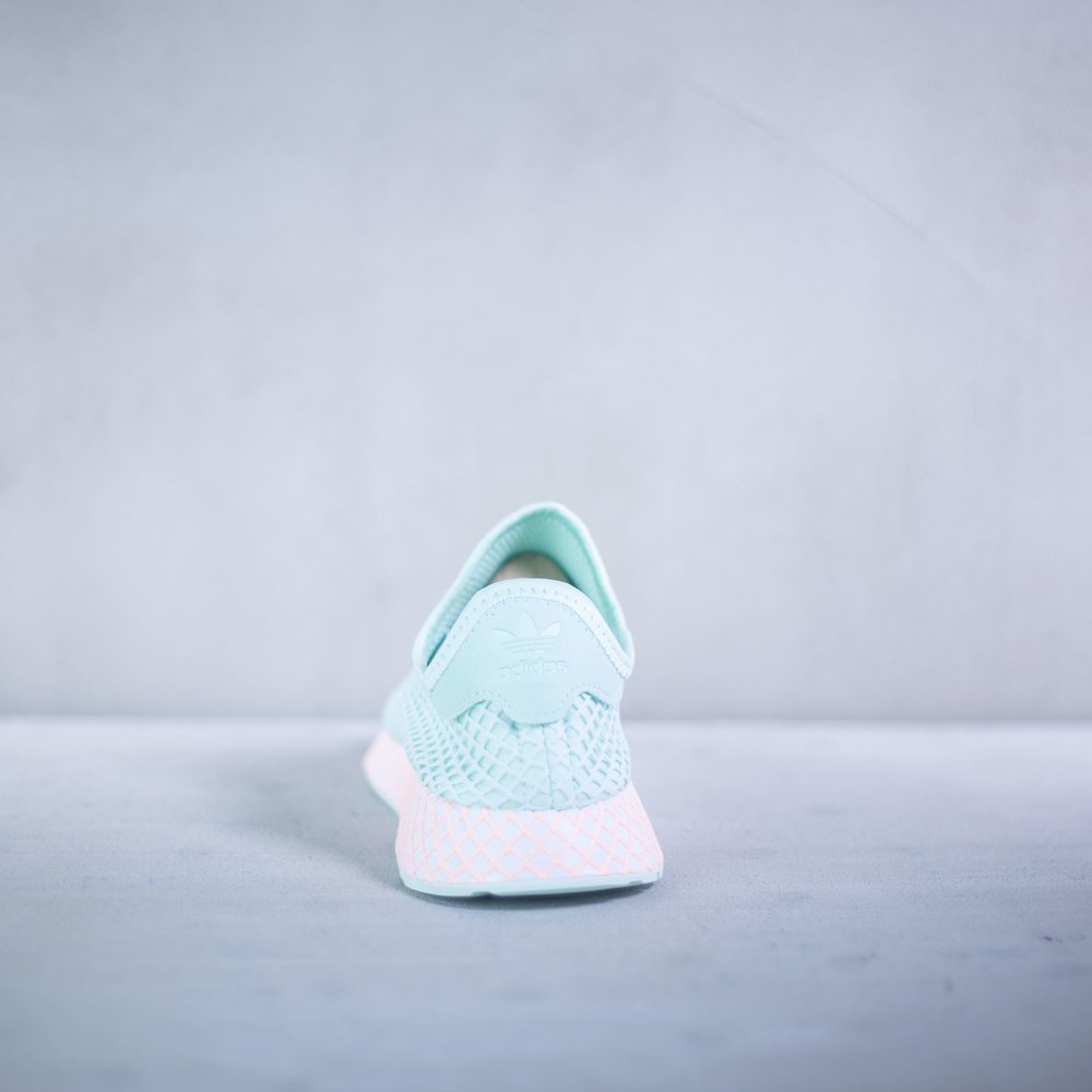 Dámske tenisky adidas model Deerupt Runner v bledomodrom prevedení s nízkym tvarom a plochými šnúrkami vo farbe tenisky. Zvršok tenisky je z poddajnej látky, ktorá je potiahnutá sieťovinou rovnakej farby. V časti pod šnúrkami sa nachádza oranžovo-ružové logo značky adidas. Logo značky je aj na päte na časti z jemnej kože. Podrážka tenisky je vyrobená z gumy, je bielej farby a je na nej potiahnutá sieťka v oranžovo-ružove farbe. Podrážka na špičke presahuje do zvršku tenisky. Tenisky majú medzipodrážku z materiálu EVA a vložku Ortholite.