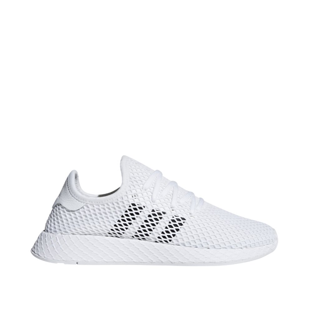 Pánske tenisky značky adidas model Deerupt Runner v bielom prevedení. Biely zvršok tenisky je potiahnutý sieťkou, ktorá má jemný krémovo-žltý nádych, sieťka na podrážke je biela. Celkový vzhľad tenisky dopĺňajú klasické tri čierne pásy po bokoch, šedé logo v jazykovej časti a nenápadné logo na päte. Tenisky majú pružný zvršok, no uťahujú sa pomocou bielych plochých šnúrok. Podrážka je vyrobená z gumy, pohodlná medzipodrážka využíva materiál EVA. V prednej časti biely spodok podrážky presahuje do látkového zvršku. Vo vnútri tenisiek sa nachádza fuknčná vložka OrthoLite.