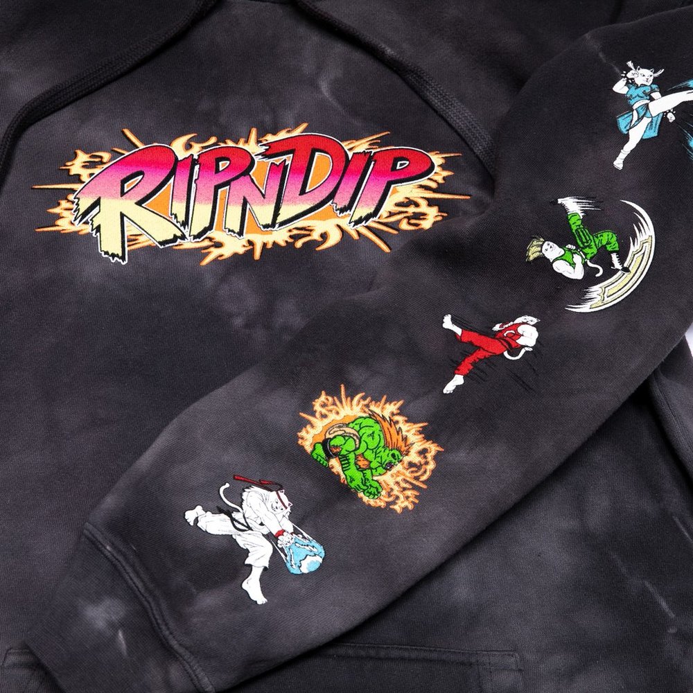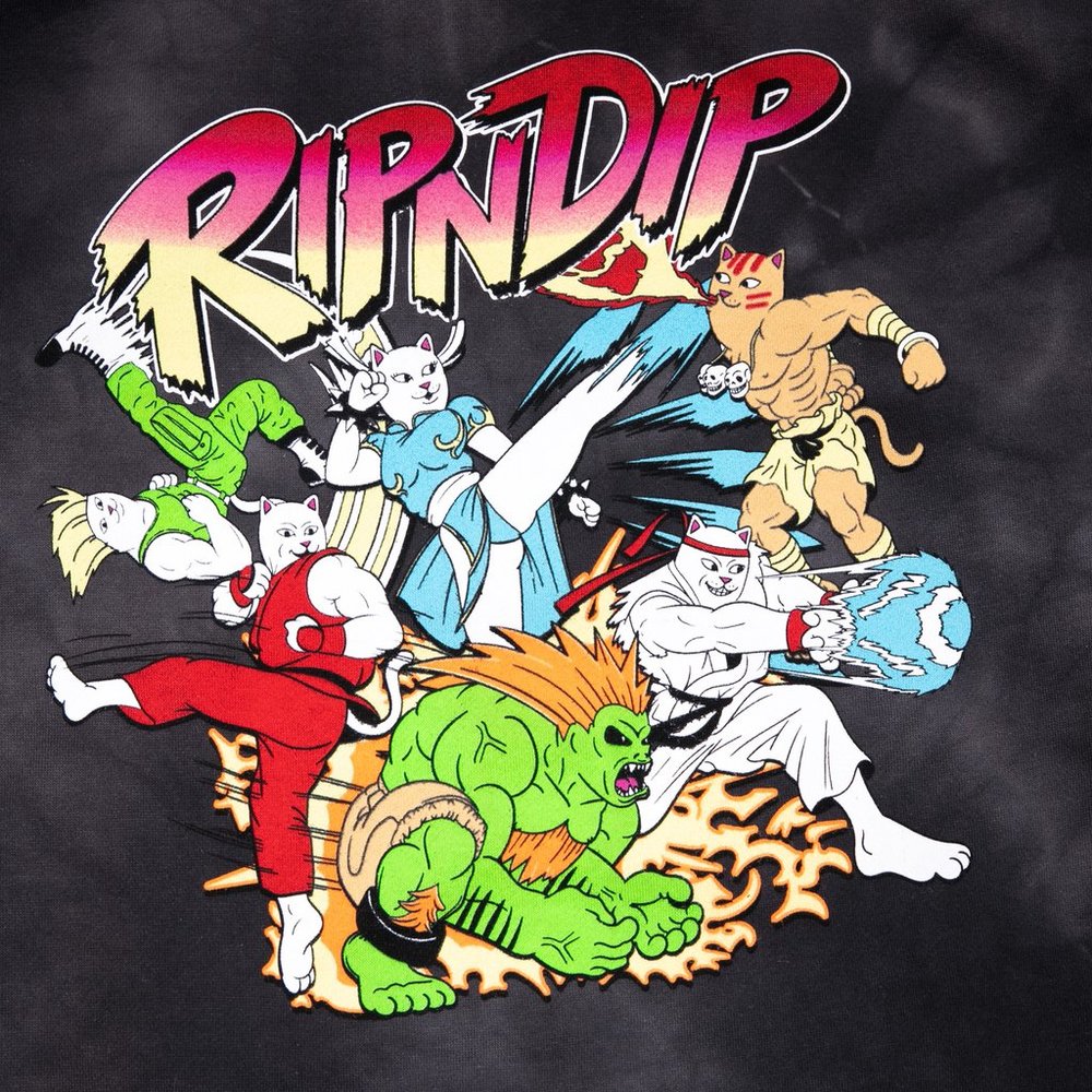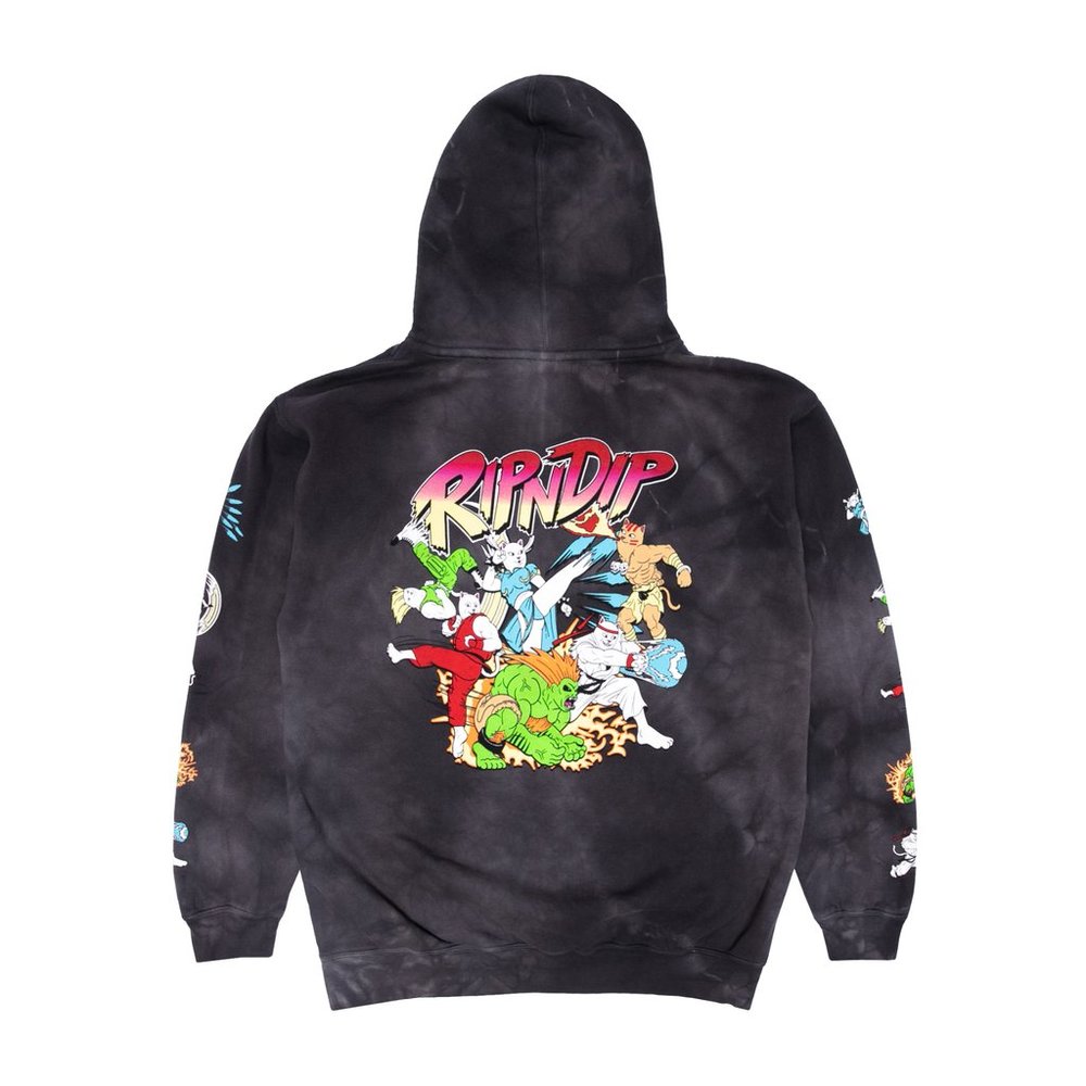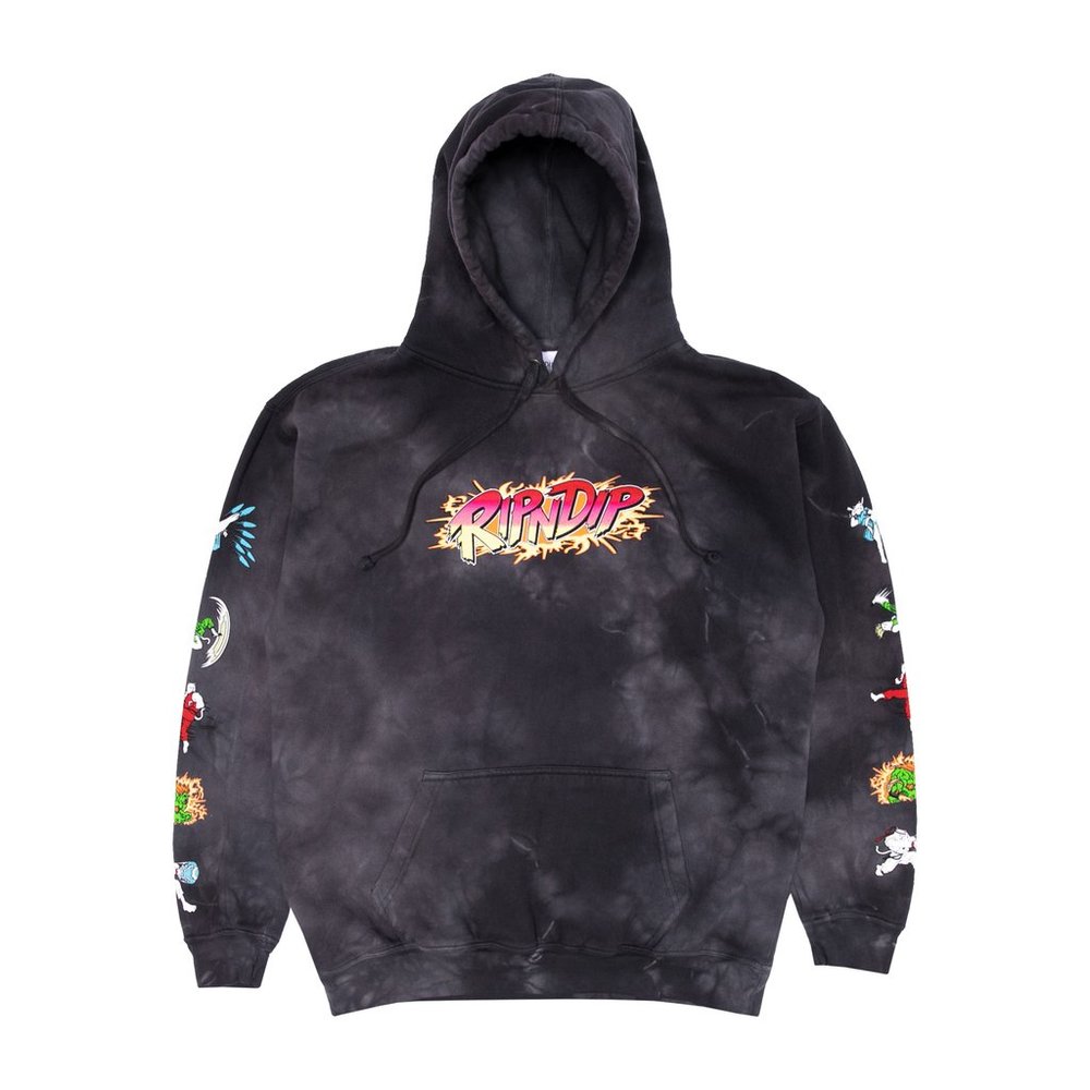 Čierna pánska mikina od značky Ripndip v modeli Nerm Fighter s vypraným dizajnom a výraznou grafikou na hrudi a chrbte. Na prednej strane sa nachádza názov značky, na chrbte je grafika s bojovými figúrkami aj s názvom značky. Potlač sa nachádza aj na rukávoch, čo vytvára pekný detail. Je pohodlného regular fit strihu a má kapucňu, ktorá sa dá utiahnuť pomocou okrúhlej šnúrky. Mikina má priestranné klokanie vrecko a dlhé rukávy, ktoré sú ukončené na pružné manžety. Mikina je vyrobená zo 100% bavlny.
