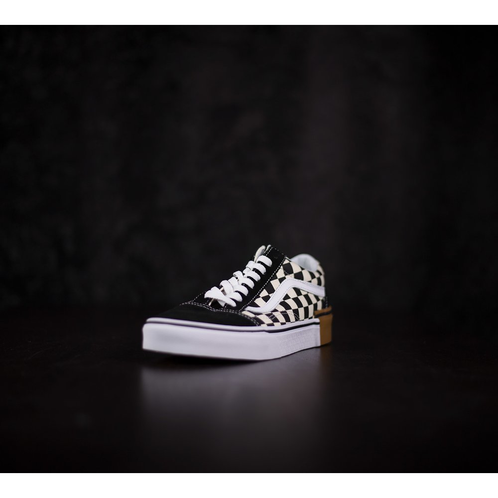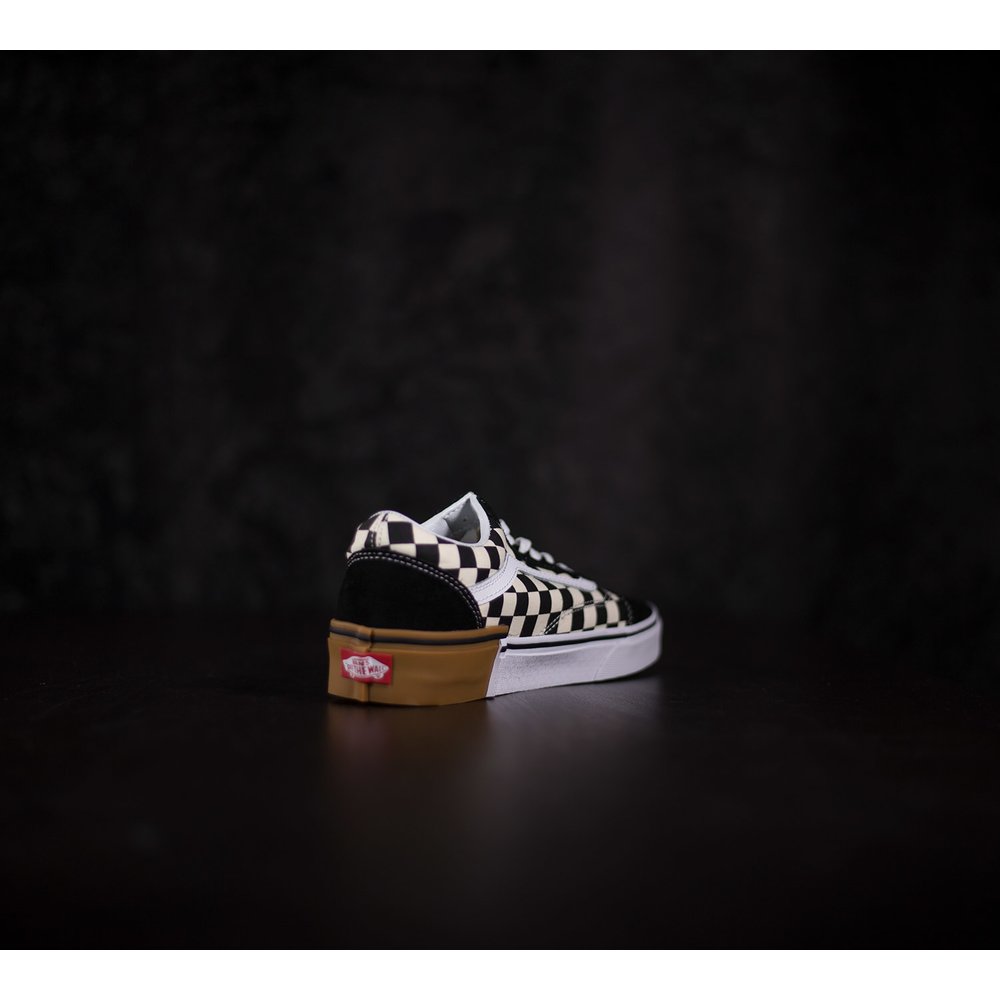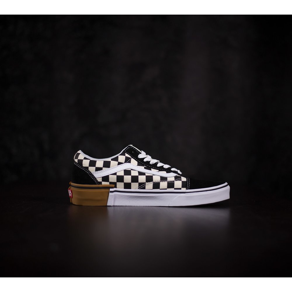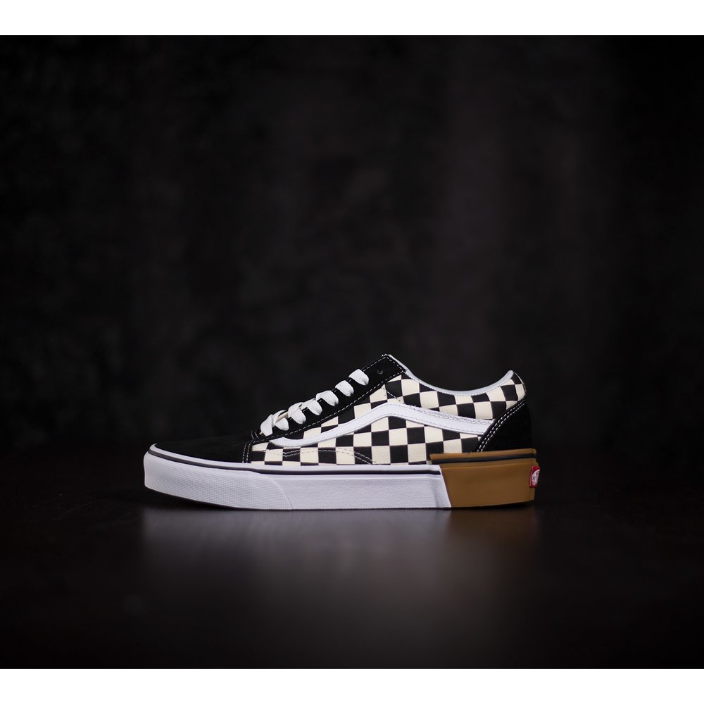 Tenisky Vans Old Skool majú pätu, špičku a okolie šnúrok z čiernej brúsenej kože. Boky tenisky sú z látky s kockovaným čierno-bielym vzorom. Vansová vlnka je z bielej kože. Dierky na šnúrky sú bez kovových krúžkov a šnúrky sú v bielej farbe. Tenisky sú prešívané bielou niťou. Podrážka je z vulknaizovanej gumy, dlhšiu prednú časť tvorí biela guma a vzadu na päte je vyššia hnedá guma, ktoré sa spolu prepájajú. Okolo obvodu podrážky je čierny pásik a vzadu na päte je červená gumená aplikácia s logom vans otw. Vnútorný materiál tenisky je z tvrdej látky a okolo členka je mäkká koža.
