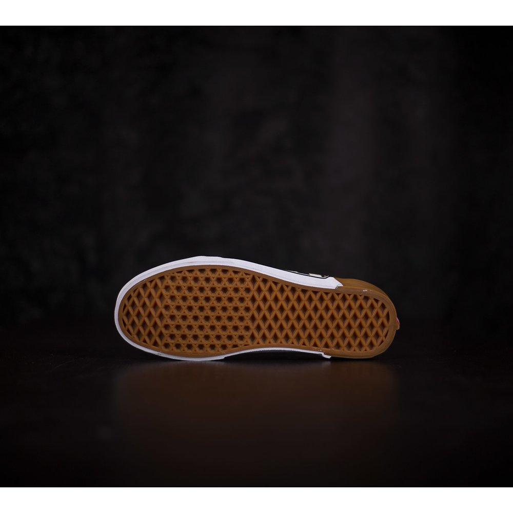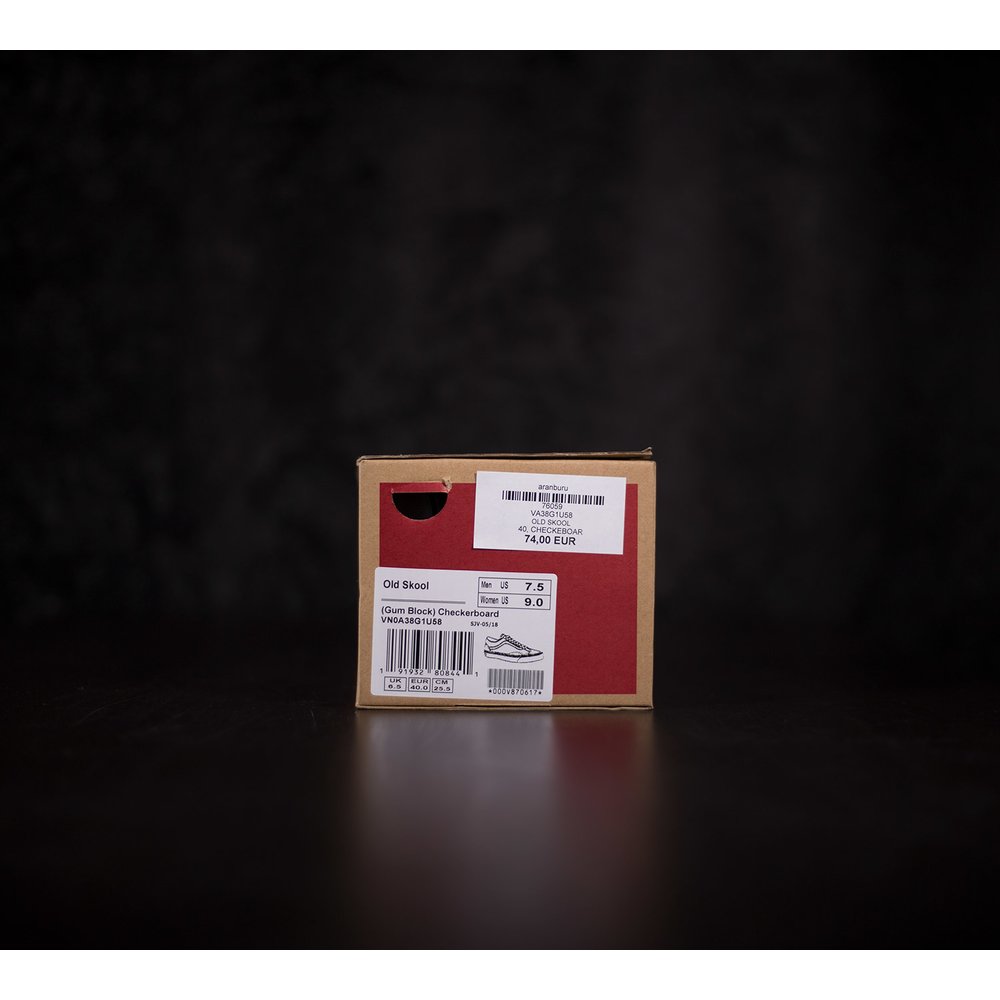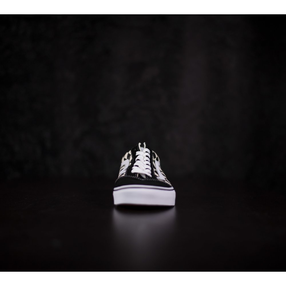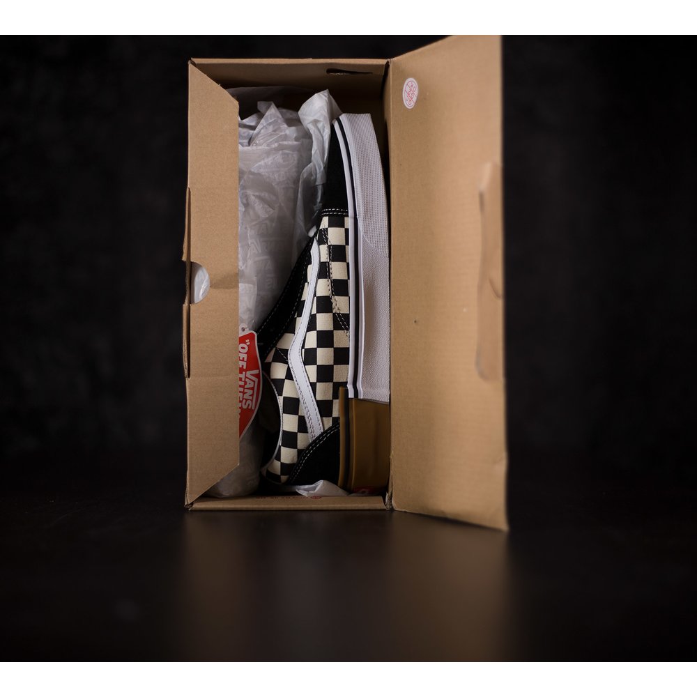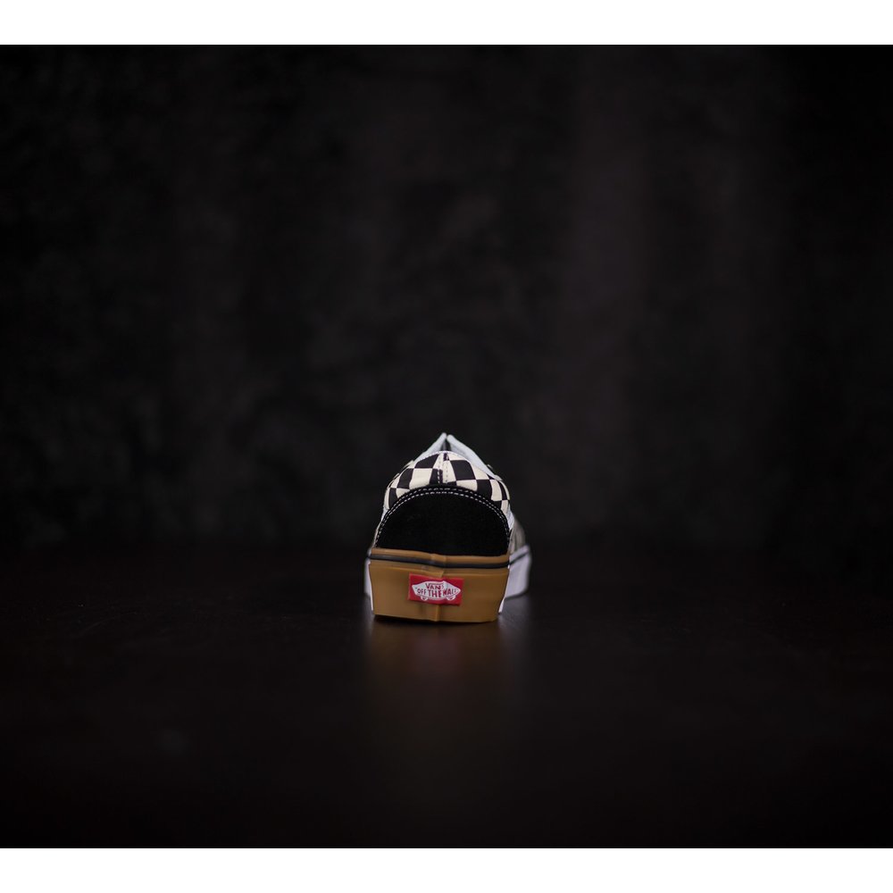 Tenisky Vans Old Skool majú pätu, špičku a okolie šnúrok z čiernej brúsenej kože. Boky tenisky sú z látky s kockovaným čierno-bielym vzorom. Vansová vlnka je z bielej kože. Dierky na šnúrky sú bez kovových krúžkov a šnúrky sú v bielej farbe. Tenisky sú prešívané bielou niťou. Podrážka je z vulknaizovanej gumy, dlhšiu prednú časť tvorí biela guma a vzadu na päte je vyššia hnedá guma, ktoré sa spolu prepájajú. Okolo obvodu podrážky je čierny pásik a vzadu na päte je červená gumená aplikácia s logom vans otw. Vnútorný materiál tenisky je z tvrdej látky a okolo členka je mäkká koža.
