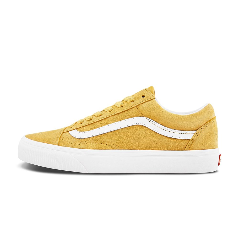 Tenisky od značky Vans model Old Skool v horčicovo-žltom prevedení s bielou podrážkou. Tenisky sú na šnurovanie pomocou plochých šnúrok vo farbe tenisiek, ktoré prechádzajú cez malé dierky vo zvršku tenisky. Zvršok tenisky je vyrobený z kože - zo semišu. Biele vlnky po bokoch sú z hladkej kože a vnútro tenisky je pevný látkový výplet. Podrážka je vyrobená z vulkanizovanej gumy, v prednej časti je zdvojená pre vyššiu odolnosť. Na pätovej časti je detail s červeným logom značky.
