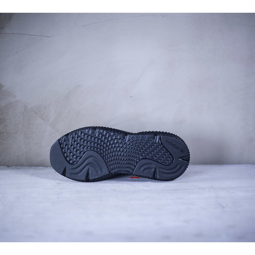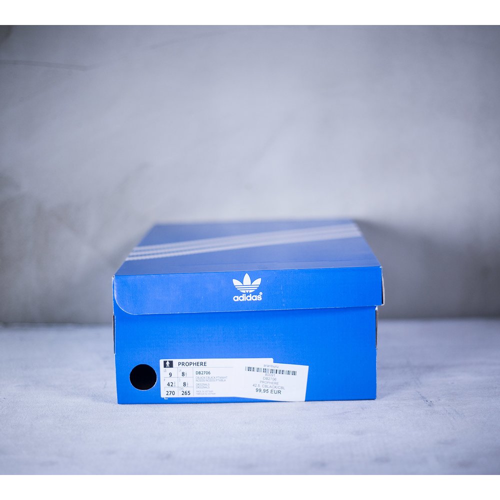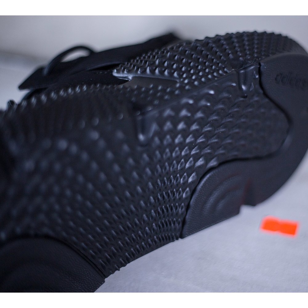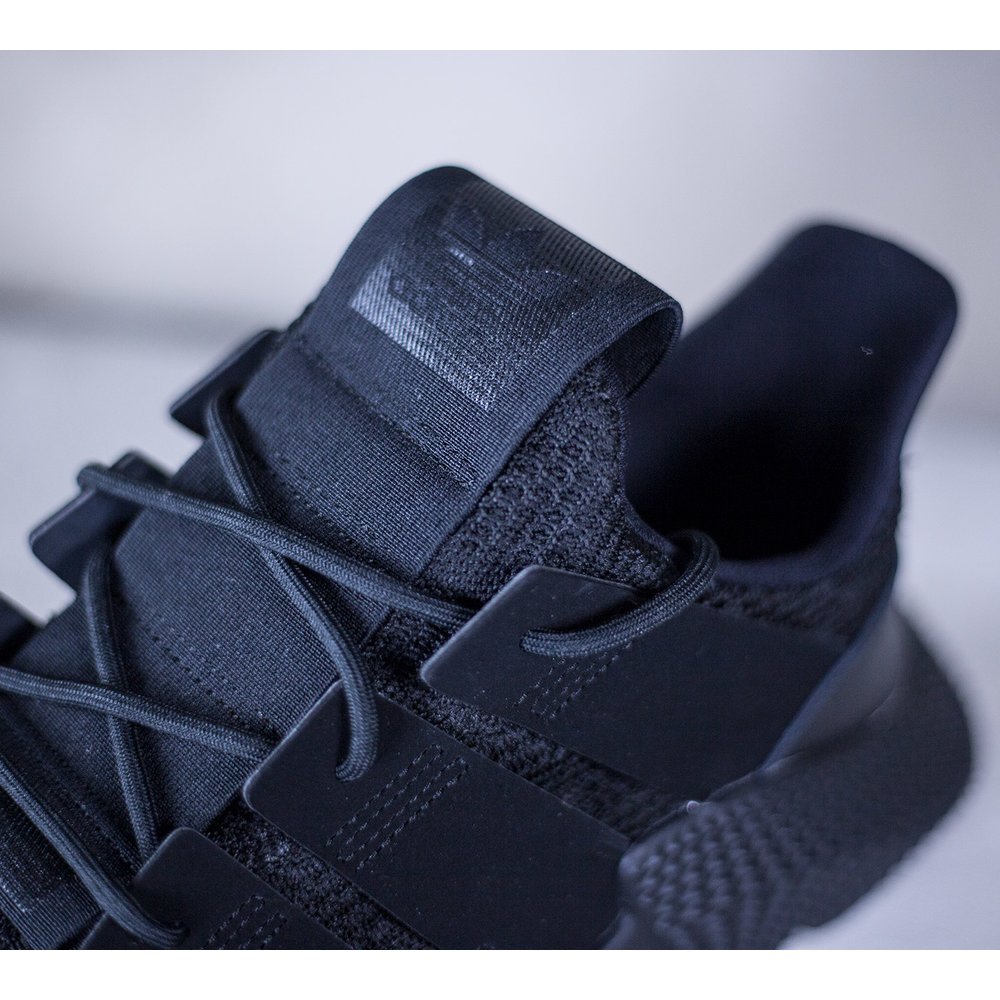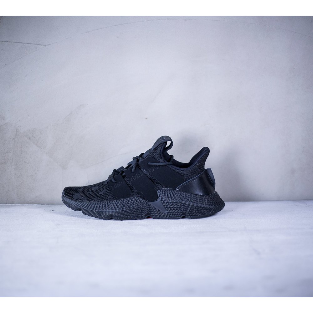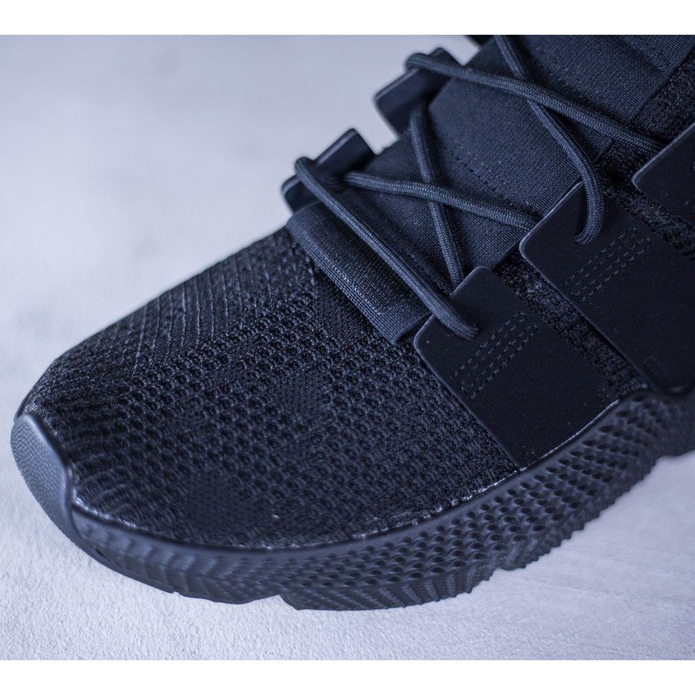 Pánske tenisky adidas model Prophere v čiernom prevedení. Tenisky majú mohutnú čiernu tvarovanú podrážku, ktorá je dominantou celej tenisky. Zvršok je z pevnejšieho úpletu. Po bokoch tenisiek sú čierne úchyty na šnúrky, ktoré sú tiež v čiernej farbe. Päta je potiahnutá hladkou kožou. Na jazyku sa nachádza čierne logo značky. Vnútro je z látky a z neoprénu.