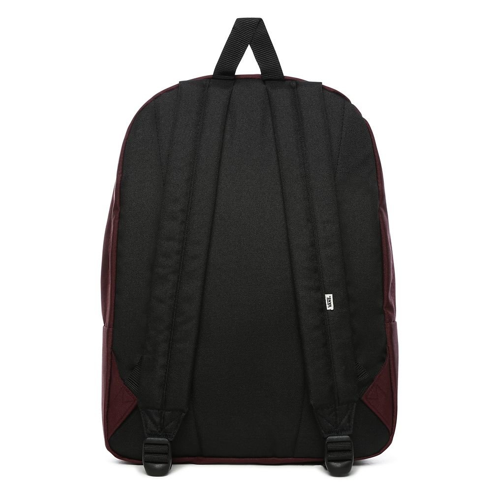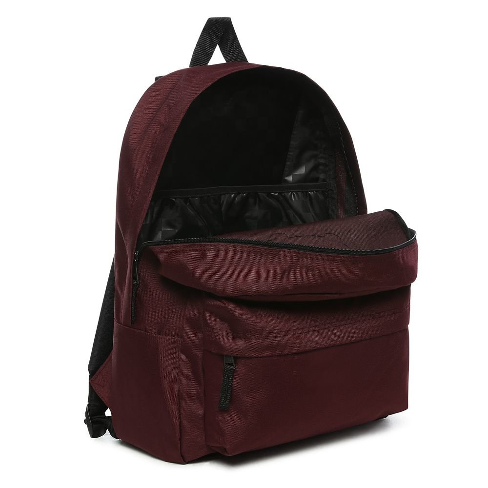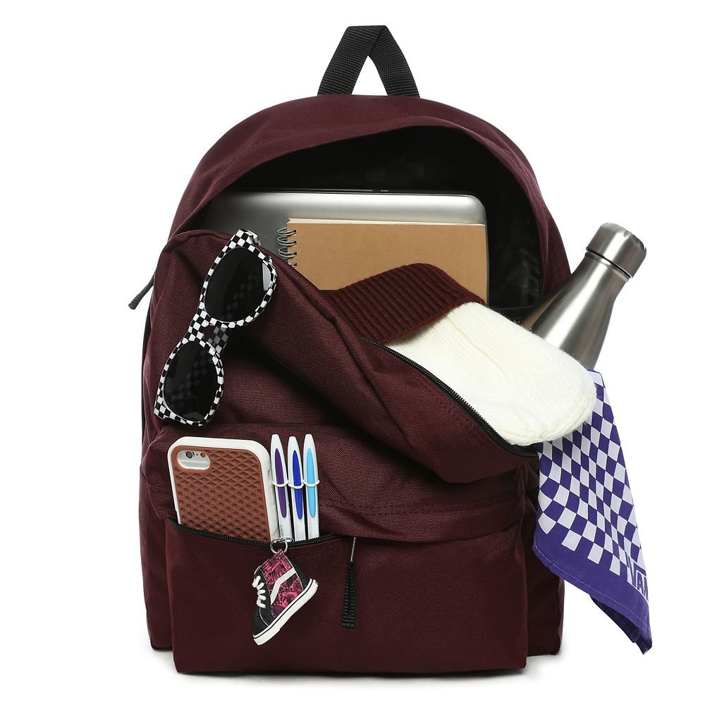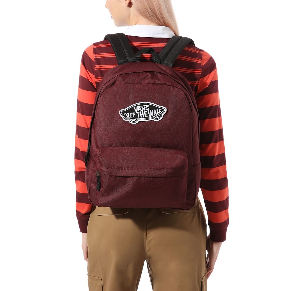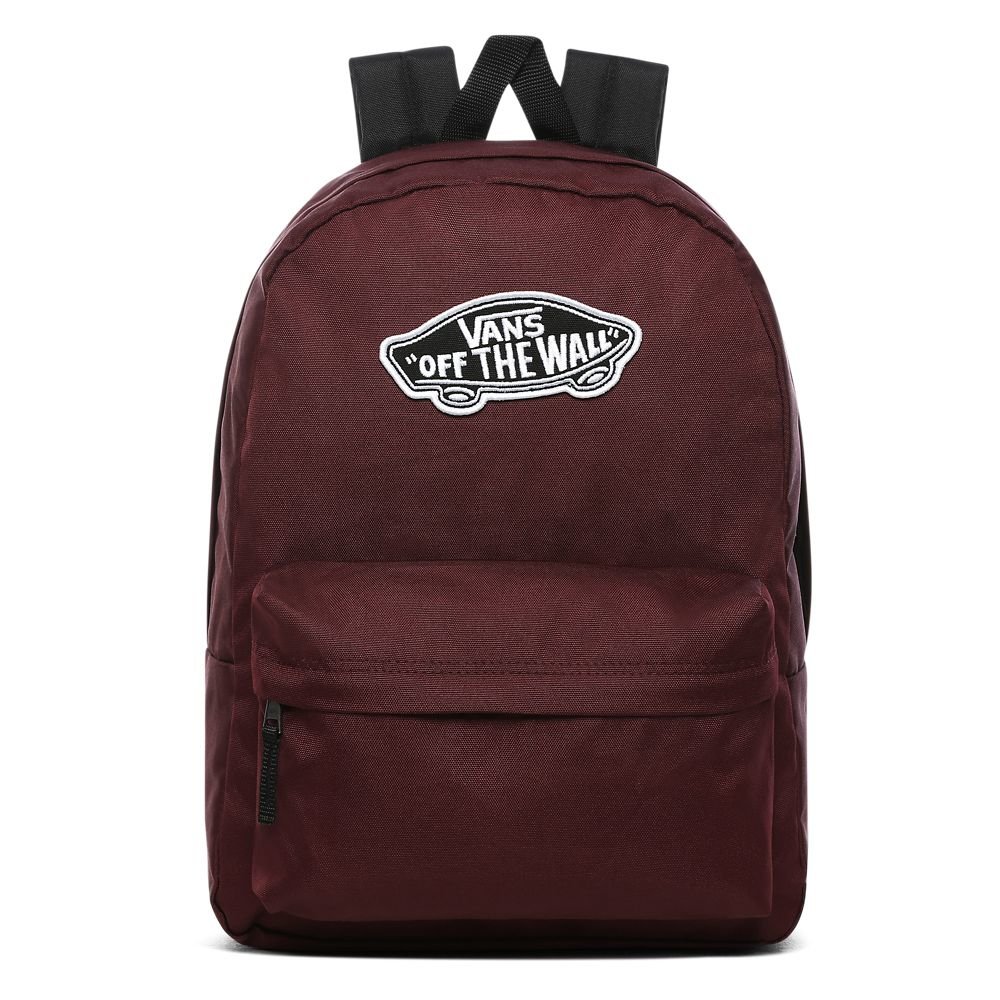 Pohodový batoh od značky Vans model Realm, ktorý je ideálny do školy. Je v neutrálnej bordovej farbe s čiernymi detailmi. Batoh má jedno hlavné vrecko, v ktorom sa nachádza priehradka na notebook, zapína sa na obojsmerný zips. Na prednej strane sa nachádza malé desiatové vrecko s organizérom, ktoré slúži na menšie predmety. Batoh má na prednej strane obľúbené logo značky. Chrbát a ramenné popruhy sú jemne vystužené. Objem je 22 litrov a jeho rozmery sú 41.91 cm x 32.39 cm x 12.07 cm. Batoh je vyrobený zo 60% polyesteru a 40% recyklovaného polyesteru.