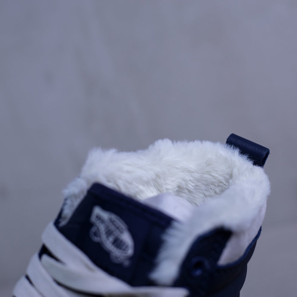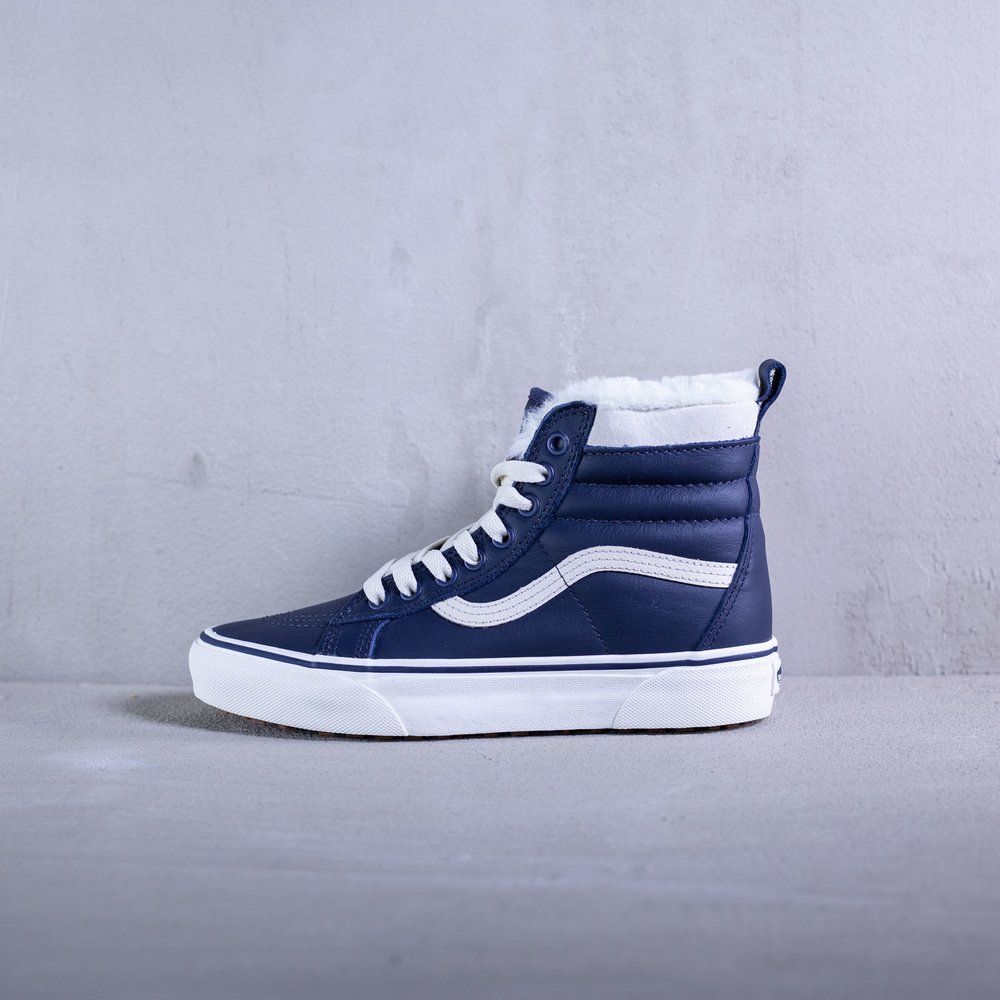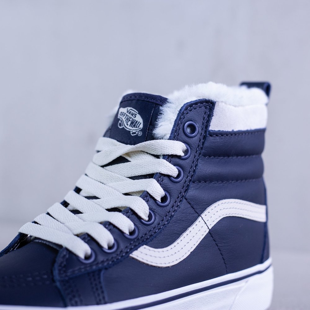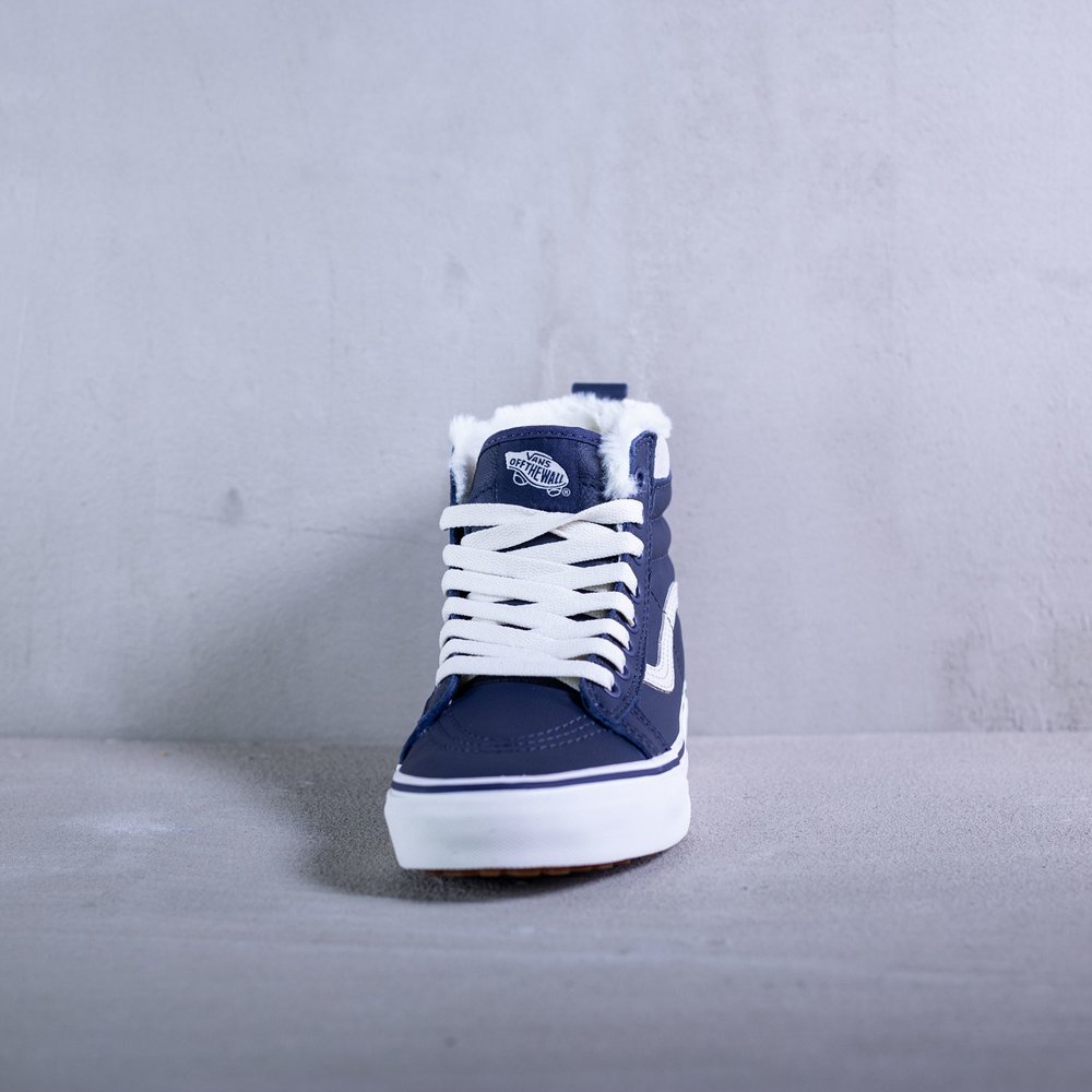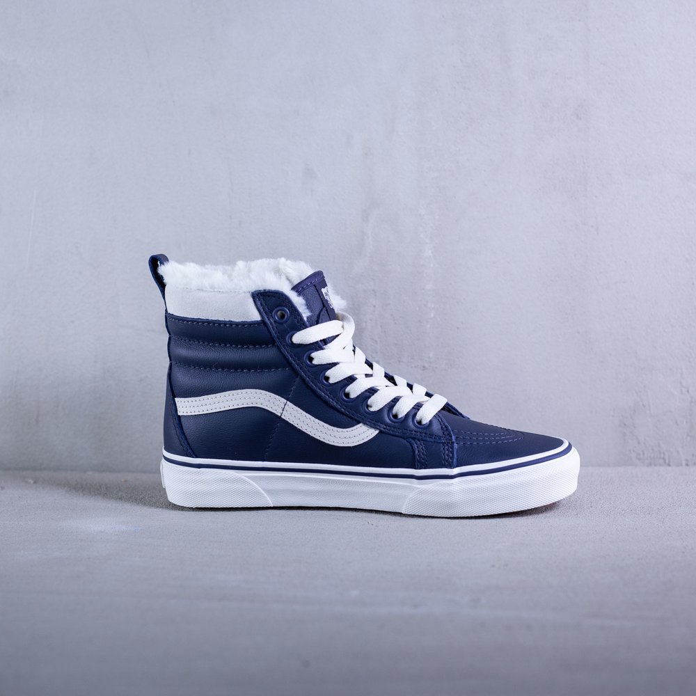 Dámske členkové zateplené tenisky Vans model Sk8-Hi Mte v parížskej modrej farbe. Sú určené do každého počasia vďaka schopnosti zadržiavania tepla a udržiavania vlhkosti. Zvršok tenisky je z kože. Tenisky sa uťahujú bielymi plochými šnúrkami, po bokoch majú biele vlnky typické pre značku Vans. Na jazyku sa nachádza modrý štítok s bielym logom značky. Vnútro tenisky tvorí kožušina. Protišmyková biela podrážka je z vulkanizovanej gumy. Na päte sa nachádza čierne logo značky na bielom podklade.