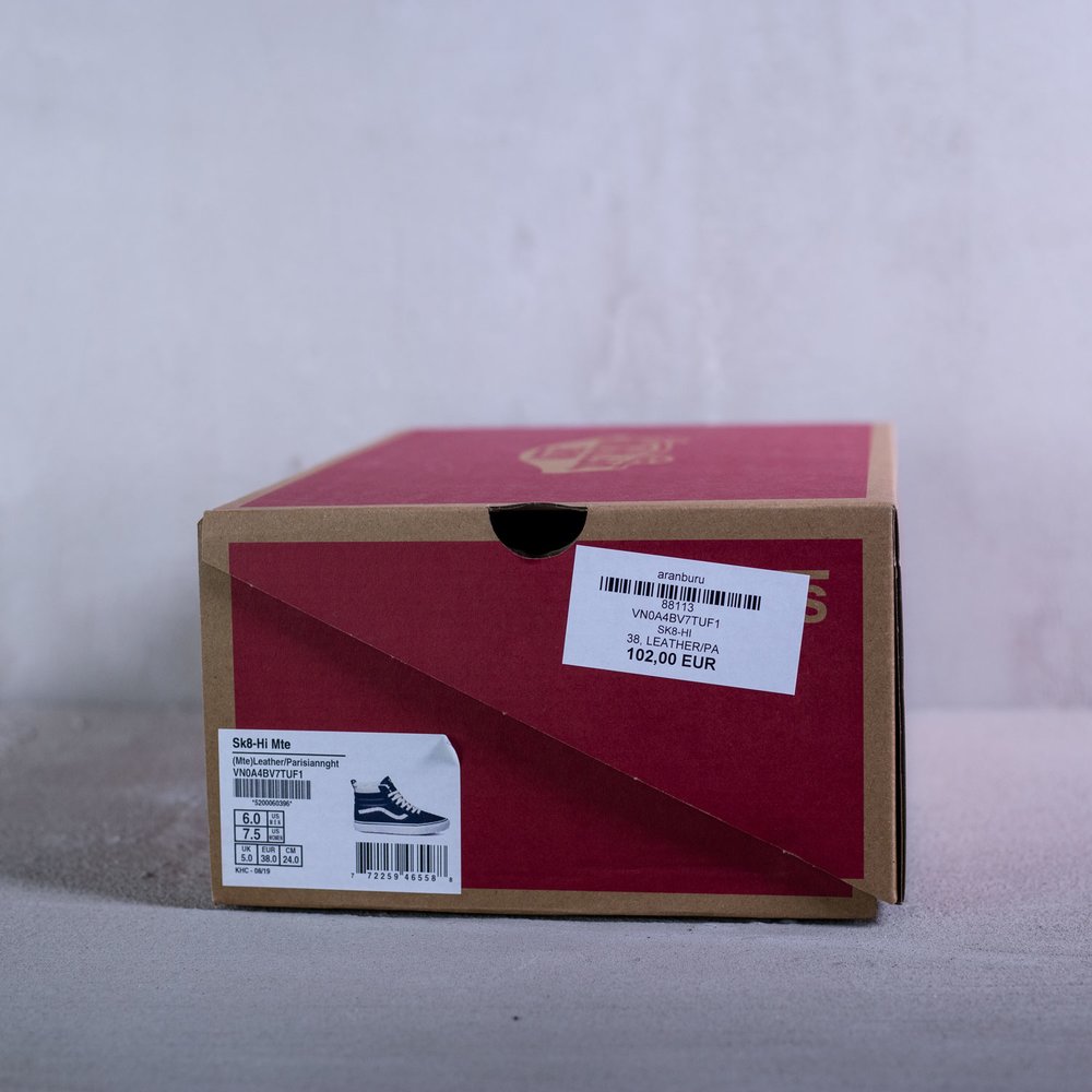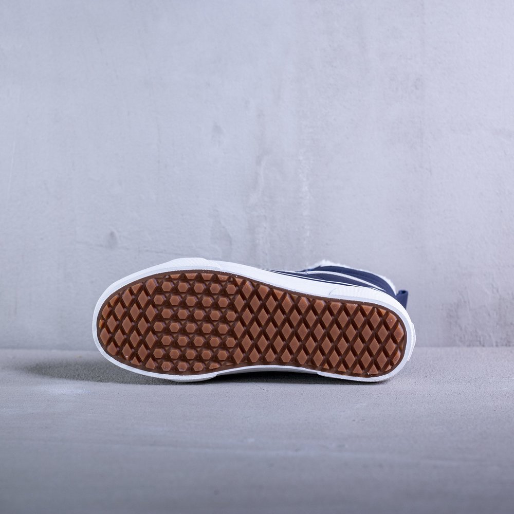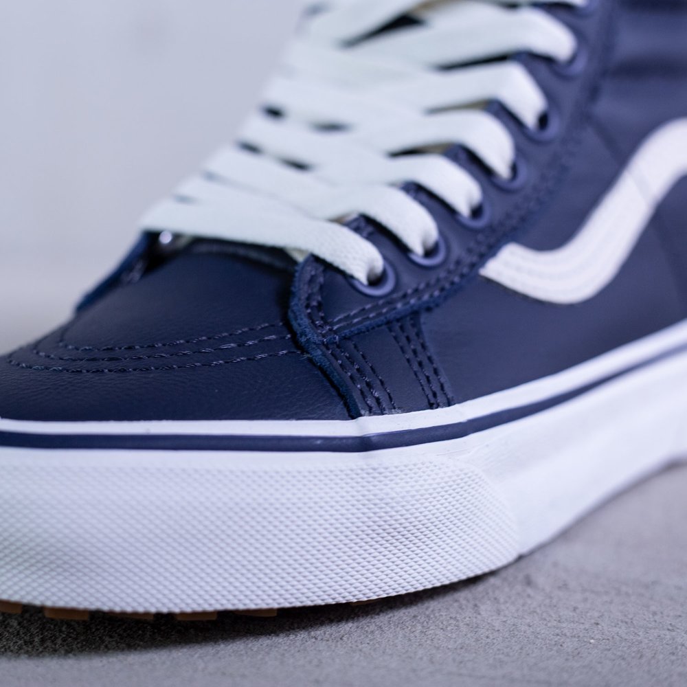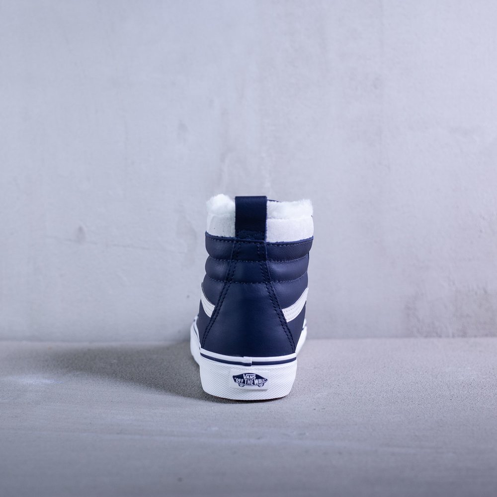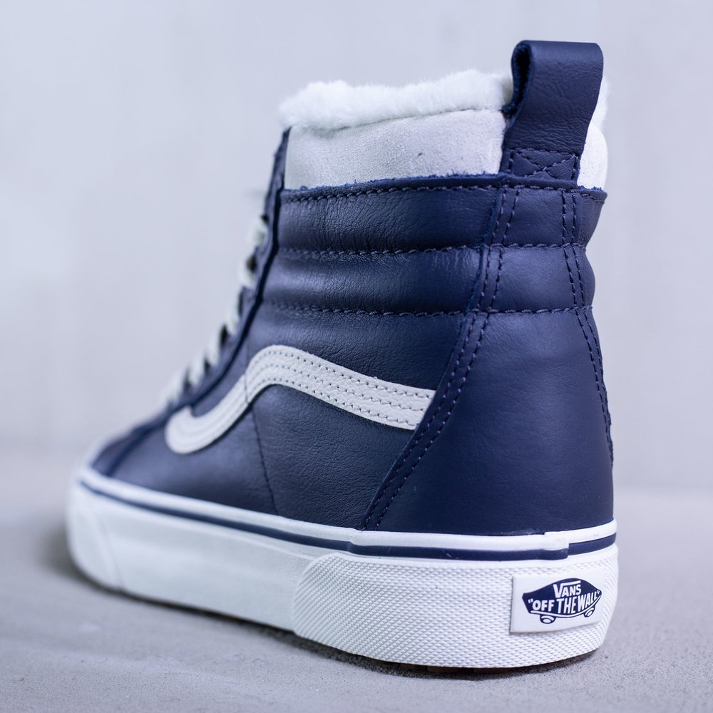 Dámske členkové zateplené tenisky Vans model Sk8-Hi Mte v parížskej modrej farbe. Sú určené do každého počasia vďaka schopnosti zadržiavania tepla a udržiavania vlhkosti. Zvršok tenisky je z kože. Tenisky sa uťahujú bielymi plochými šnúrkami, po bokoch majú biele vlnky typické pre značku Vans. Na jazyku sa nachádza modrý štítok s bielym logom značky. Vnútro tenisky tvorí kožušina. Protišmyková biela podrážka je z vulkanizovanej gumy. Na päte sa nachádza čierne logo značky na bielom podklade.