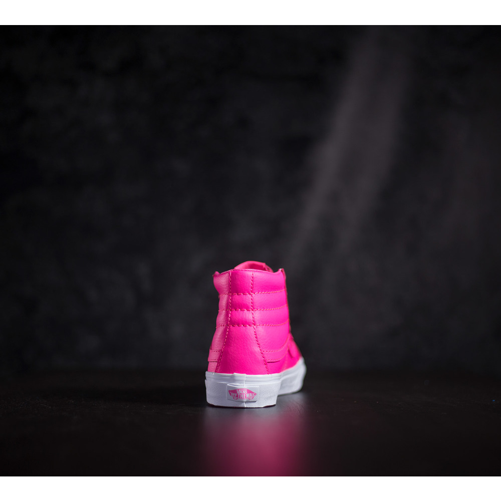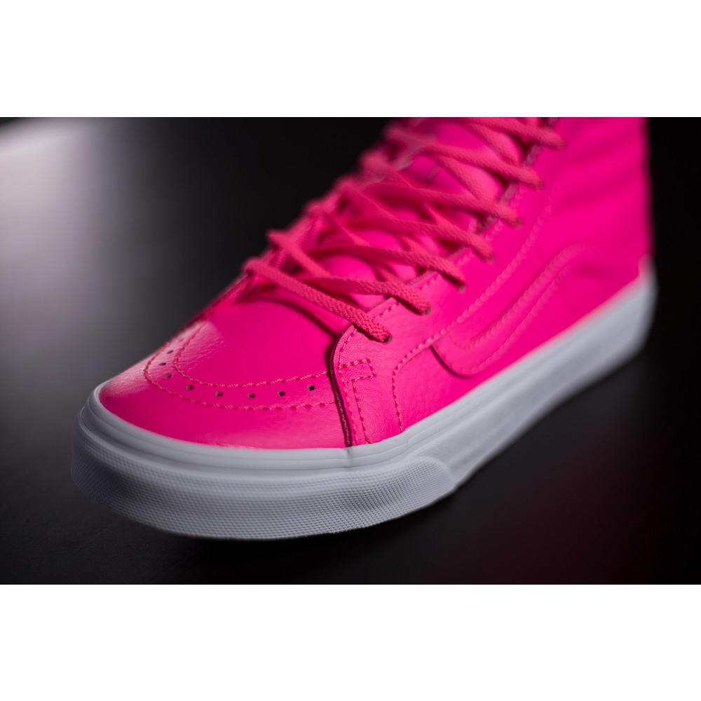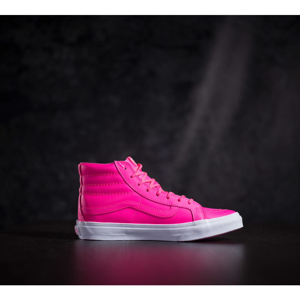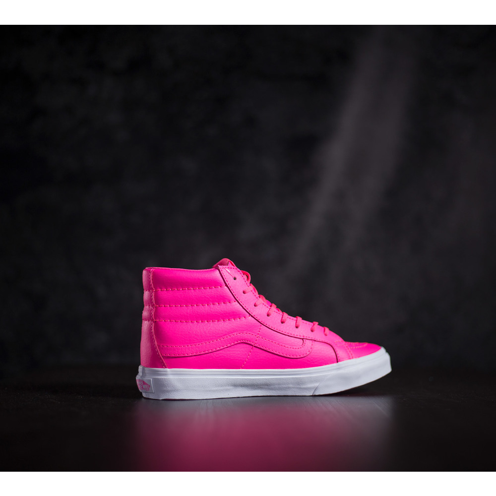 Dámske celokožené tenisky Vans Sk8-hi Slim v neónovo ružovom prevedení členkového tvaru. Na špičke sa nachádzajú dierky v polkruhovom tvare, na boku tenisky sa nachádzajú klasické vans prúžky v rovnakej farbe ako celé tenisky. Na bielej vulkanizovanej podrážke vzadu sa nachádza malý detail s ružovým logom Vans. Na jazyku v hornej časti je ružová nášivka značky s bielym logom Vans. Šnúrky sú v rovnakej farbe ako celé tenisky, čiže neónovo ružové.