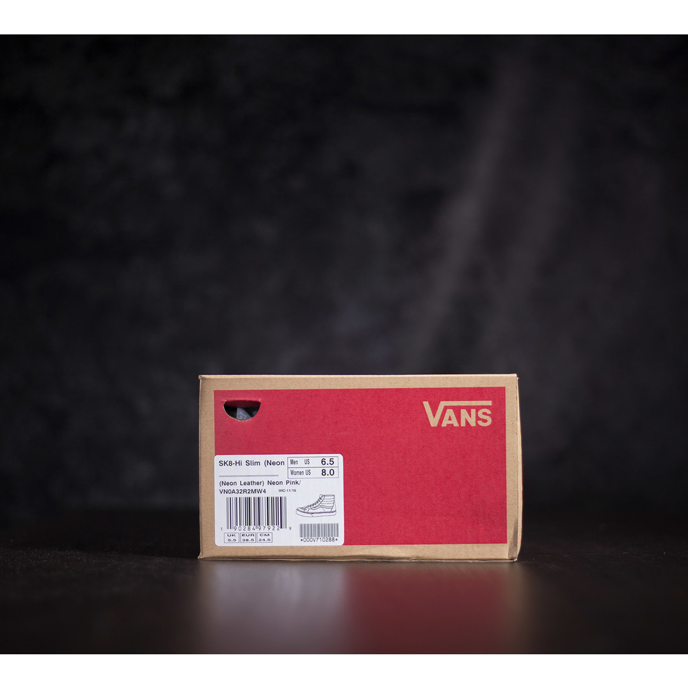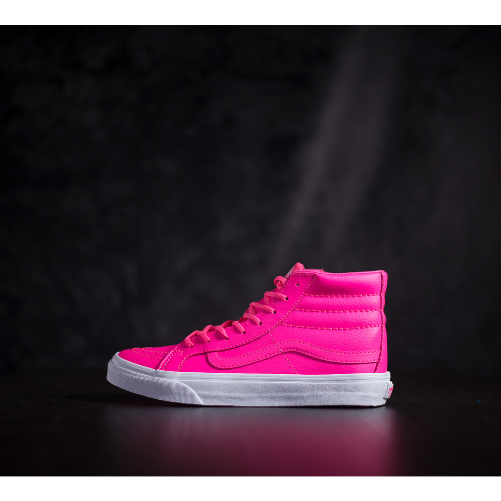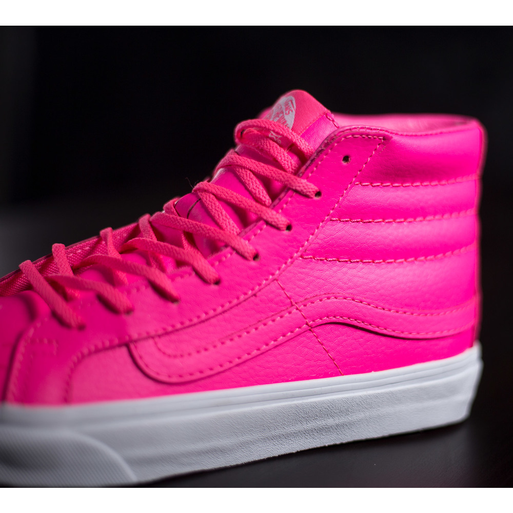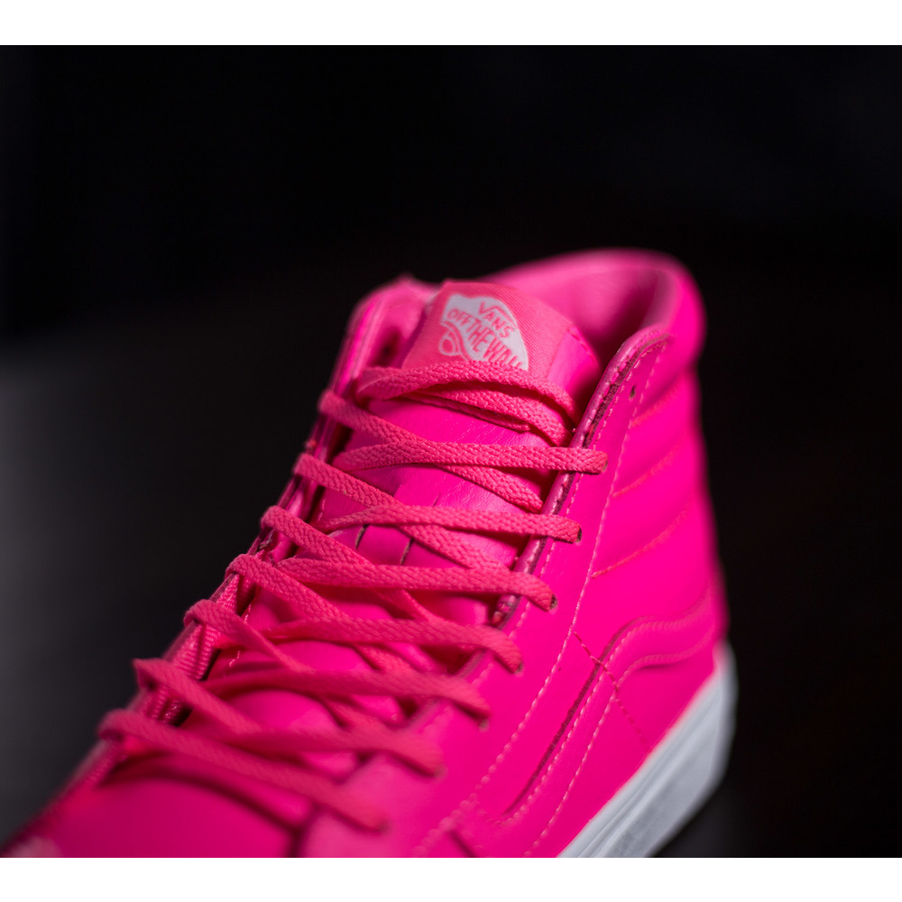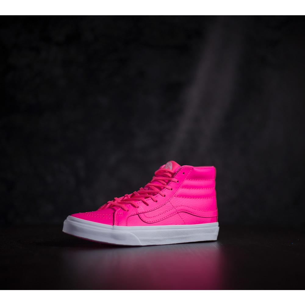 Dámske celokožené tenisky Vans Sk8-hi Slim v neónovo ružovom prevedení členkového tvaru. Na špičke sa nachádzajú dierky v polkruhovom tvare, na boku tenisky sa nachádzajú klasické vans prúžky v rovnakej farbe ako celé tenisky. Na bielej vulkanizovanej podrážke vzadu sa nachádza malý detail s ružovým logom Vans. Na jazyku v hornej časti je ružová nášivka značky s bielym logom Vans. Šnúrky sú v rovnakej farbe ako celé tenisky, čiže neónovo ružové.